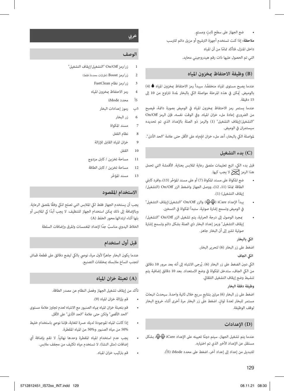 Lorsque l’appareil est mis en marche, il est toujours réglé selon le réglage iCare , indépendamment du dernier réglage choisi. Pour passer d’un réglage à un autre, appuyez sur le bouton sélecteur iMode (5a). Eco Ce réglage est recommandé pour les tissus les plus délicats tels que les tissus synthétiques, la soie ou les tissus métissés. Ce réglage permet de réduire la consommation d’énergie.