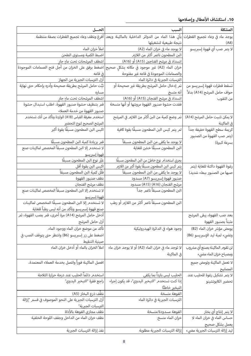 Cause De l’eau se trouve dans le bac Cette eau provient des circuits internes de la égouttoir (A8) machine et est une conséquence normale de leur fonctionnement L’expresso n’est pas distribué Pas d’eau dans le réservoir d’eau (A2) Le café est moulu trop finement Colmatage dans le filtre à café (A15) ou (A16) Le réservoir d’eau (A2) n’est pas correctement mis en place et les vannes en son fond ne sont pas ouvertes Calcaire dans le circuit d’eau L’expresso s’écoule par les Le porte-filtre a été mal inséré ou est sale bords du porte-filtre (A14) et Colmatage dans le filtre à café (A15) ou (A16) non par les orifices Le joint de la buse à café a perdu de son élasticité ou est sale Le porte-filtre (A14) ne Le filtre a été rempli avec trop de café s’accroche pas à la machine La crème du café est trop Le café prémoulu n’a pas été pressé assez fort légère (la buse à café l’a Il n’y a pas assez de café prémoulu distribuée trop vite) Le café prémoulu est trop grossier Le type de café prémoulu utilisé n’est pas correct