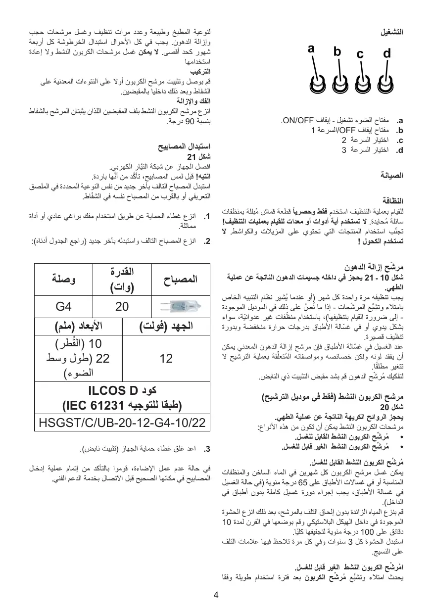 + Ne pas utiliser ou laisser la hotte sans les lampes correcte- ment montées, car un éventuel risque de choc électrique est possible.