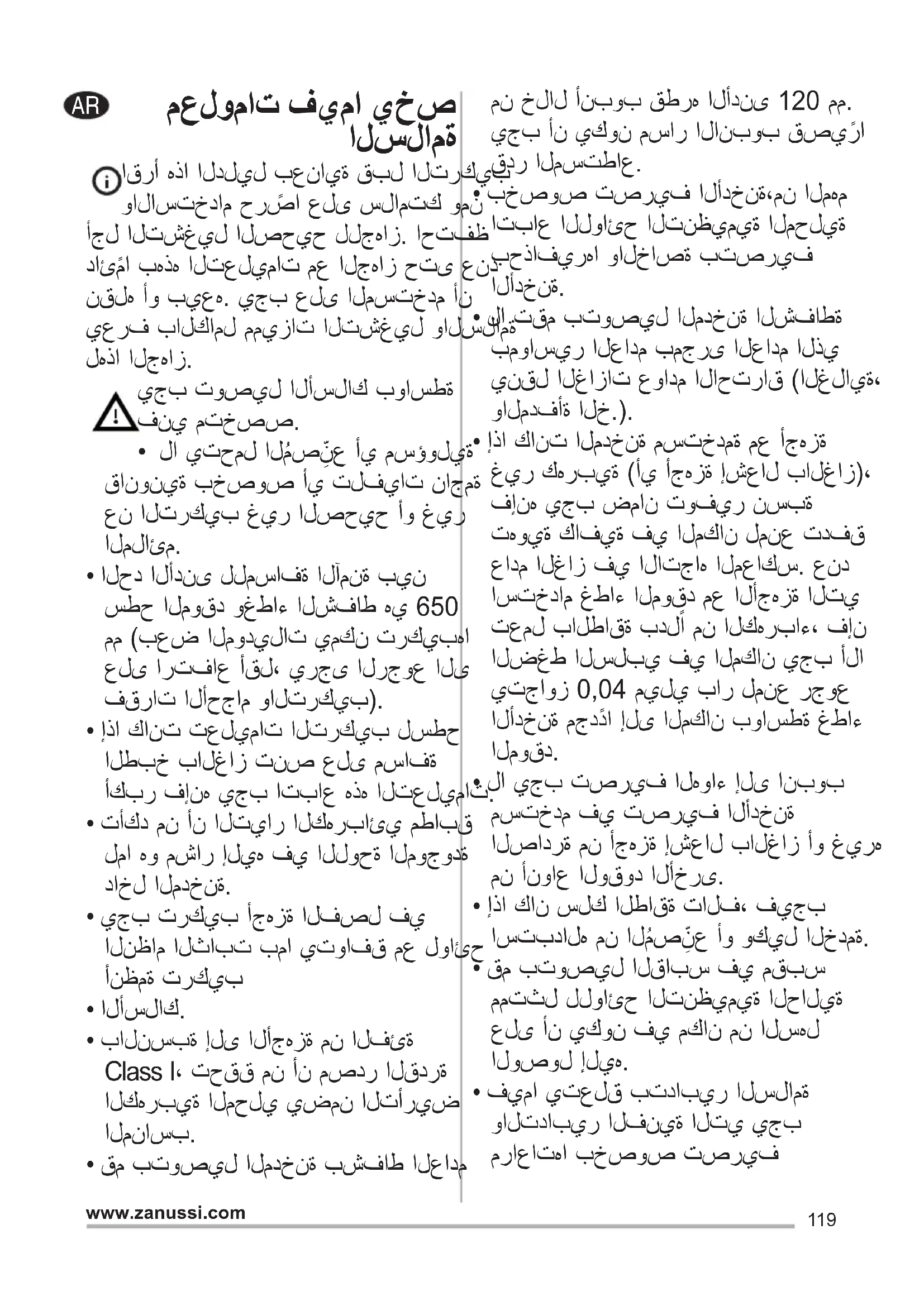 - فيما يتعلق بتدابير السلامة والتدابير الفنية التي يجب مراعاتها بخصوص تصريف120 www.zanussi.com