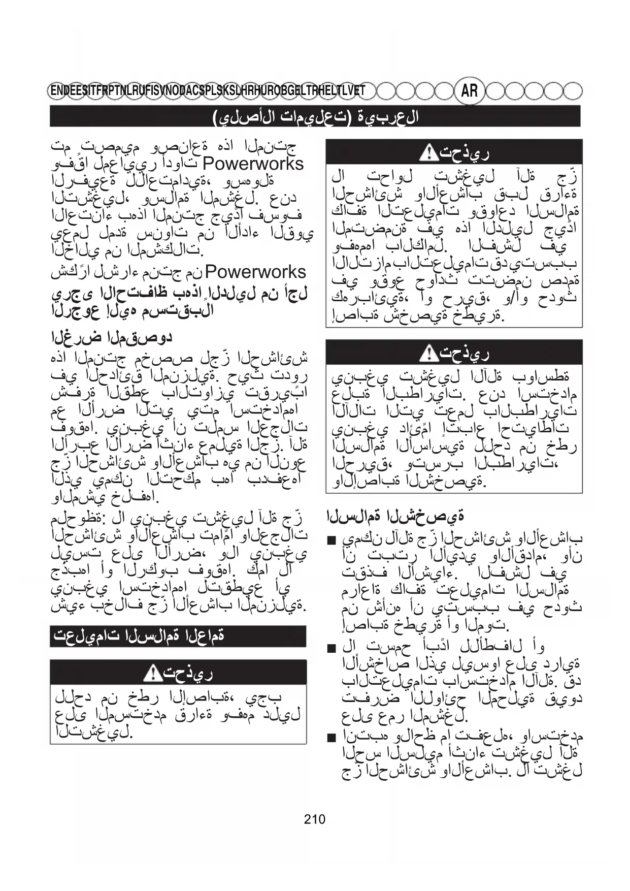 EN DE ES IT FR PT NL RU FI SV NO DA CS PL SK SL HR HU RO BG EL TR HE LT LV ET تم تصميم وصناعة هذا المنتج وفقًا لمعايير أدوات Powerworks الرفيعة للاعتمادية، وسهولة التشغيل، وسلامة المشغل. عند الاعتناء بهذا المنتج جيدًا فسوف يعمل لمدة سنوات من الأداء القوي الخالي من المشكلات. شكرًا لشراء منتج من Powerworks يرجى الاحتفاظ بهذا الدليل من أجل الرجوع إليه مستقبلًا الغرض المقصود هذا المنتج مخصص لجزّ الحشائش في الحدائق المنزلية. حيث تدور شفرة القطع بالتوازي تقريبًا مع الأرض التي يتم استخدامها فوقها. ينبغي أن تلمس العجلات الأربع الأرض أثناء عملية الجزّ. آلة جزّ الحشائش والأعشاب هي من النوع الذي يمكن التحكم بها بدفعها والمشي خلفها. ملحوظة: لا ينبغي تشغيل آلة جزّ الحشائش والأعشاب تمامًا والعجلات ليست على الأرض، ولا ينبغي جذبها أو الركوب فوقها. كما لا ينبغي استخدامها لتقطيع أي شيء بخلاف جزّ الأعشاب المنزلية. تعليمات السلامة العامة