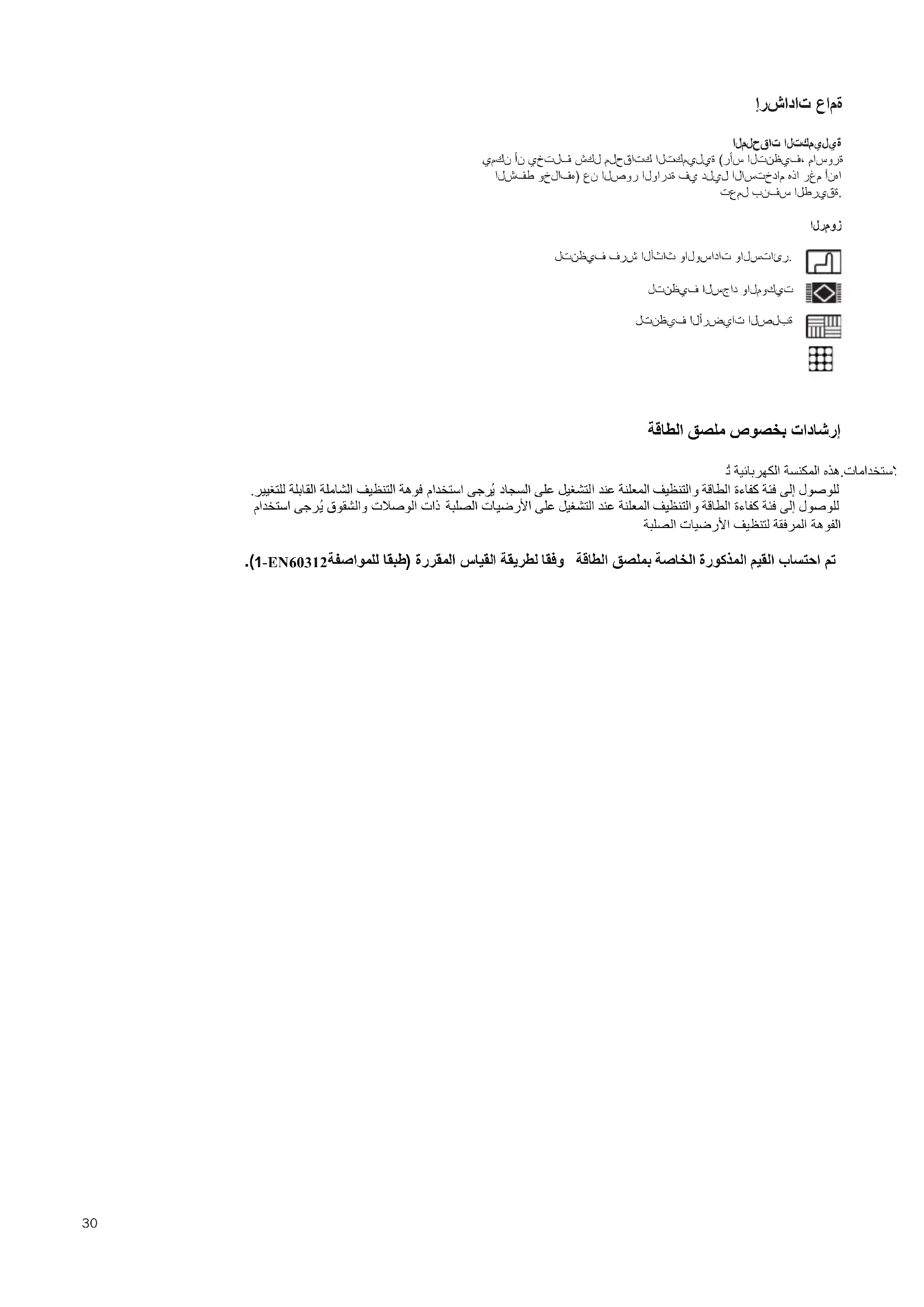 إرشادات عامة الملحقات التكميلية يمكن أن يختلف شكل ملحقاتك التكميلية (رأس التنظيف، ماسورة الشفط وخلافه) عن الصور الواردة في دليل الاستخدام هذا رغم أنها تعمل بنفس الطريقة.