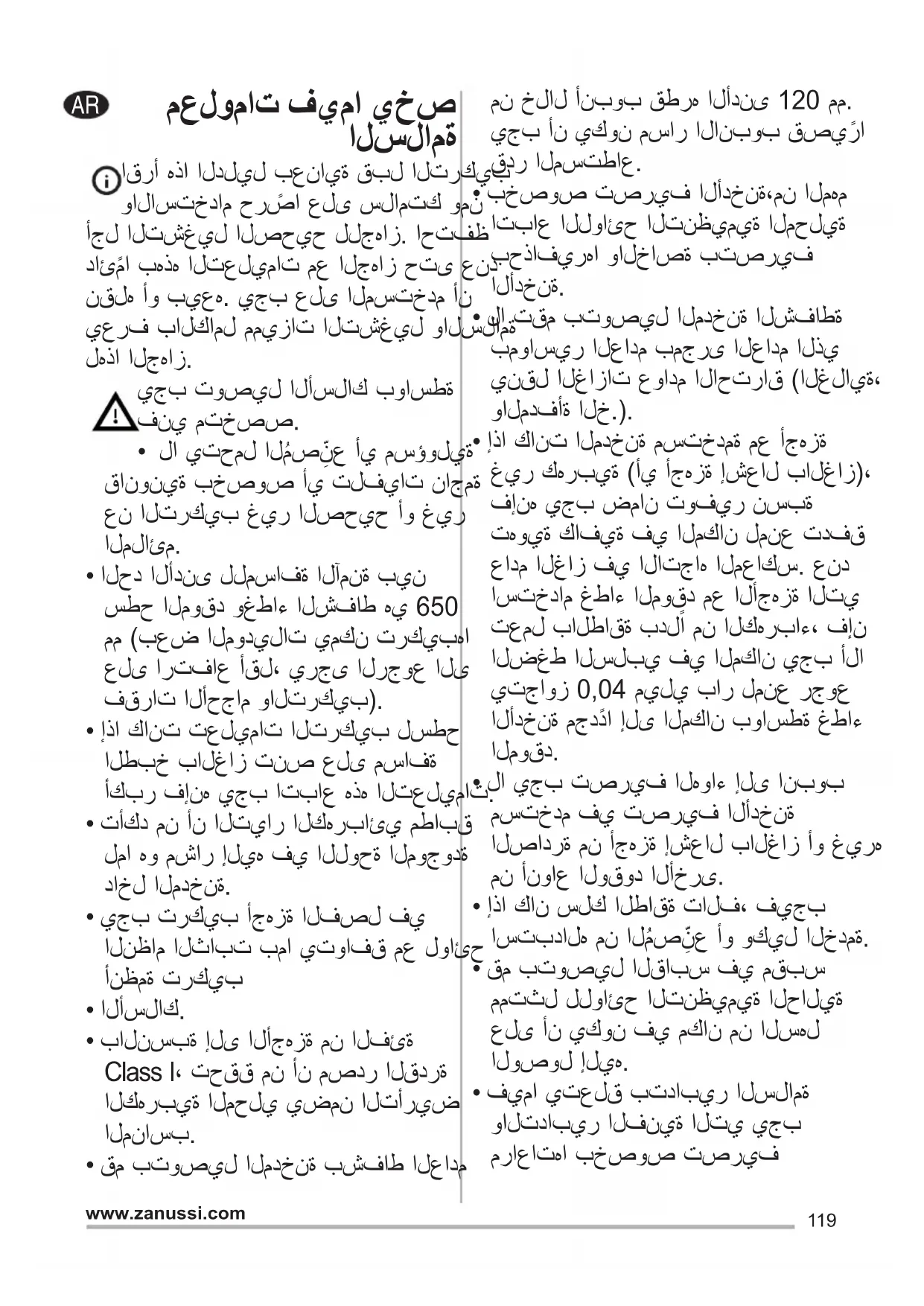 - التعامل معه على أنه من فئة النفايات المنزلية. بل يجب تسليمه إلى نقطة جمع نفايات متخصصة في إعادة تدوير المعدات الكهربية والإلكترونية. عند التأكد من التخلص من هذا المنتج بطريقة صحيحة، فأنت تساعد بذلك في منع حدوث عواقب سلبية على البيئة والصحة البشرية، والتي قد تقع بالفعل بسبب التعامل غير السليم مع المنتج كنفاية. عند التأكد من التخلص من هذا المنتج بطريقة صحيحة، فأنت تساعد بذلك في منع حدوث عواقب سلبية على البيئة والصحة البشرية، والتي قد تقع بالفعل بسبب التعامل غير السليم مع المنتج كنفاية. لمزيد من المعلومات عن إعادة تدوير هذا المنتج، يُرجى الاتصال على مكتب المدينة المحلي، أو خدمة التخلص من النفايات المنزلي، أو المتجر الذي اشتريت منه هذا المنتج.121 www.zanussi.com