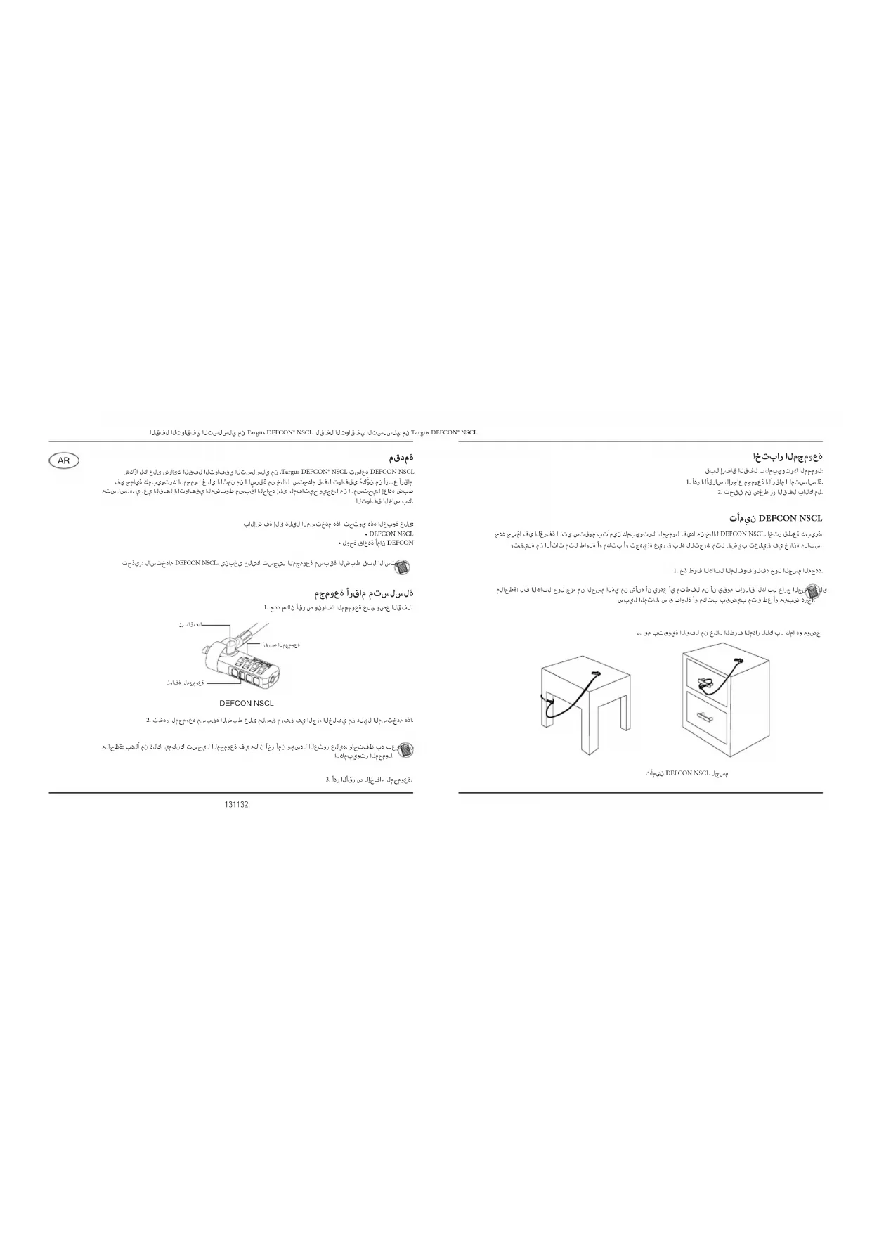 إلغاء قفل DEFCON NSCL135 136 folding line 2 staples here (saddle stitching) folding line 2 staples here (saddle stitching) Open size: 9”W x 4.5”H Folded Size: 4.5”W x 4.5”H Material: 80gsm woodfree paper Color: Grayscale Diecut القفل التواقفي التسلسلي من Targus DEFCON® NSCL القفل التواقفي التسلسلي من Targus DEFCON® NSCL حلقة تثبيت مطاطية _x0003_ قابلة للإزالة بالنسبة للأجهزة التي تتضمن تجهيزة أضيق لقفل الأمان، فمن المهم إزالة حلقة التثبيت الموجودة على قفل الكابل. حلقة تثبيت قابلة للإزالة لوحة قاعدة أمان DEFCON تم تضمين لوحة قاعدة الأمان مع قفل كابل مجموعة DEFCON NSCL الخاصة بك للحصول على أمان أجهزة الكمبيوتر
