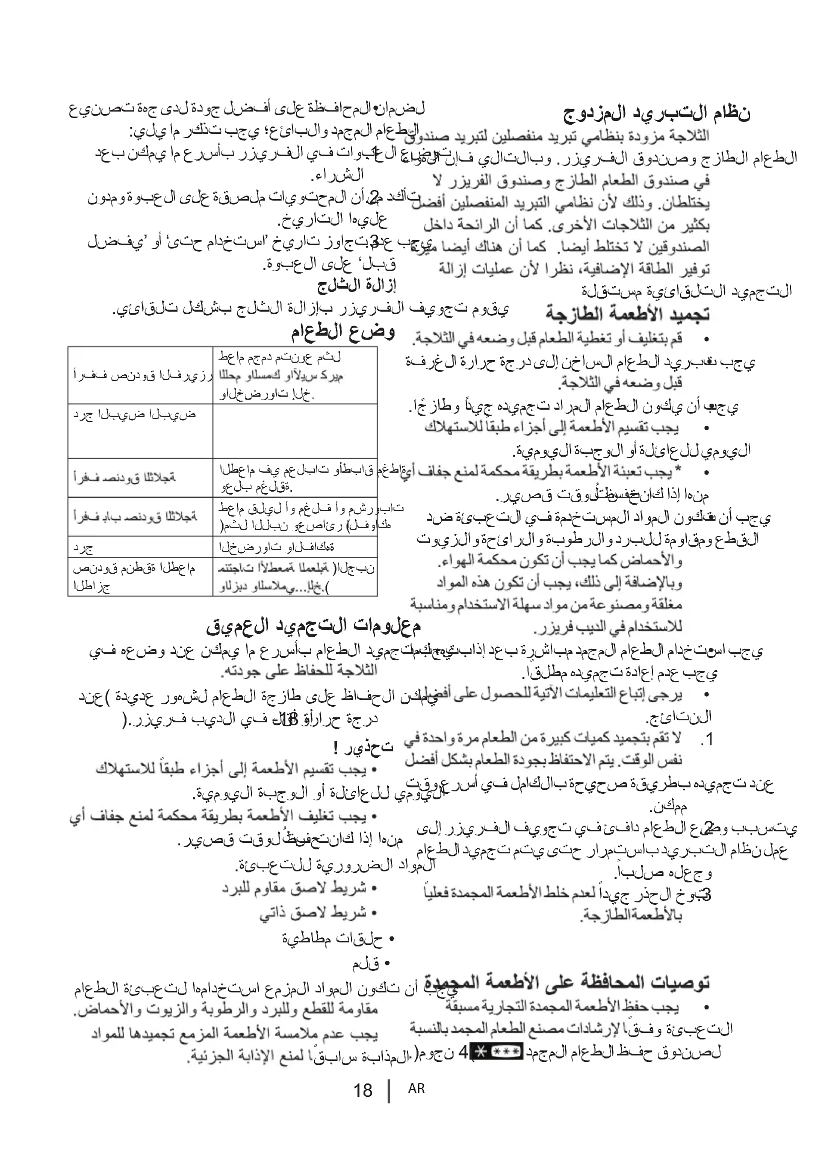 أرفف صندوق الفريزر طعام مجمد متنوع مثل والخضروات إلخ. درج البيض البيض الطعام في معلبات وأطباق مغطاة وعلب مغلقة. طعام قليل أو مغلف أو مشروبات )مثل اللبن وعصائر الفواكه( درج الخضروات والفاكهة صندوق منطقة الطعام