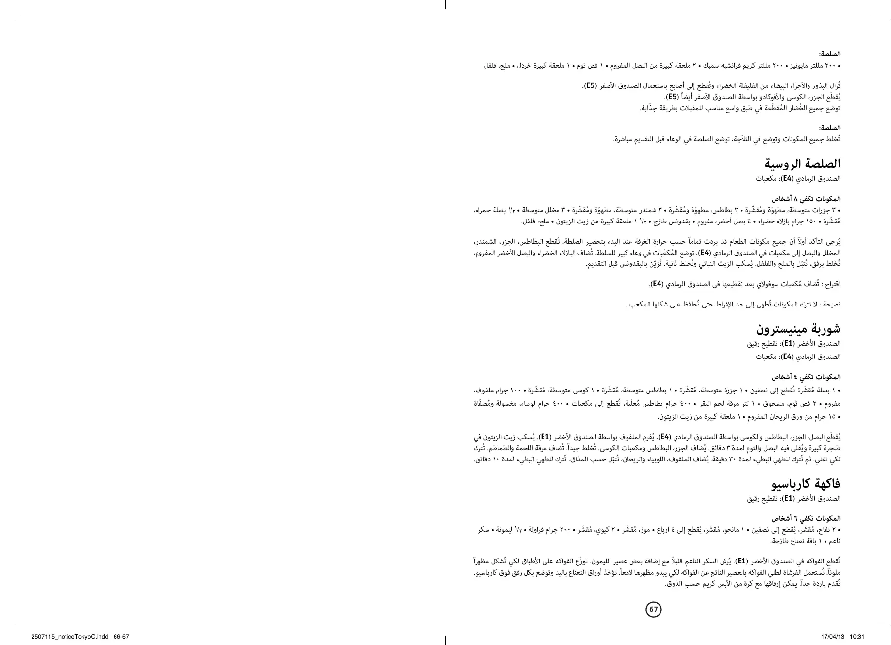 المكونات تكفي 8 – 6أشخاص 5جزرات متوسطة الحجمُ ،مقشّ رة 1خیارة متوسطة الحجمُ ،مقشّ رة 1كوسى متوسطة الحجمُ ،مقشّ رة 2فليفلة خضراء 1أوفوكادو تُزال منها البذور 68 4 2507115_noticeTokyoC.indd 68-69