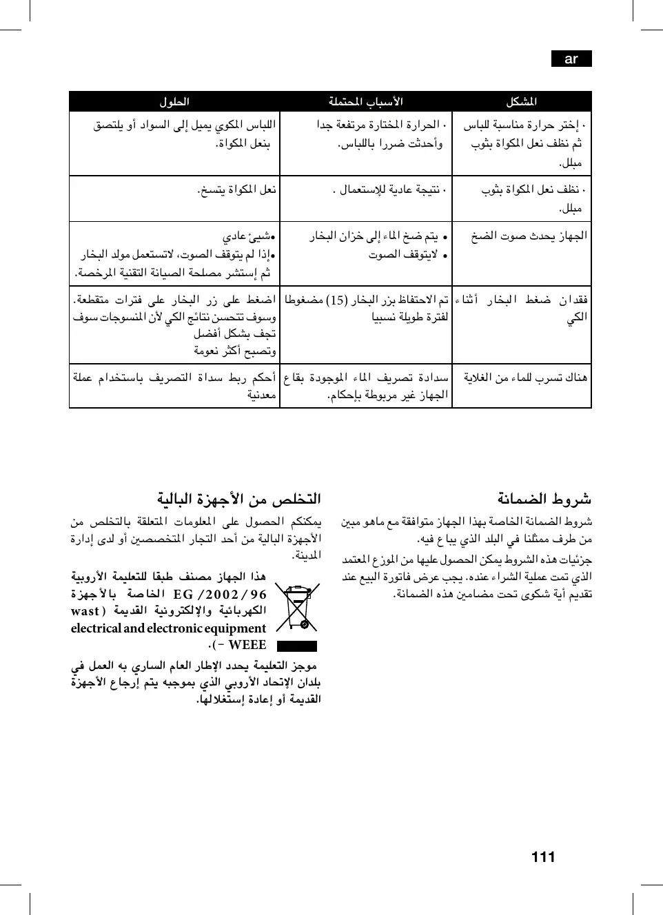 - إذا لم يتوقف الصوت ،اتستعمل مولد البخار ثم إستشر مصلحة الصيانة التقنية امرخصة. فقدان ضغط البخار أثناء م ااحتفاظ بزر البخار ( )15مضغوطا اضغط على زر البخار على فترات متقطعة. وسوف تتحسن نتائج الكي أن امنسوجات سوف لفترة طويلة نسبيا جف بشكل أفضل وتصبح أكثر نعومة هناك تسرب للماء من الغاية سدادة تصريف اماء اموجودة بقاع أحكم ربط سداة التصريف باستخدام عملة اجهاز غير مربوطة بإحكام. شروط الضمانة شروط الضمانة اخاصة بهذا اجهاز متوافقة مع ماهو مبن من طرف مثلنا في البلد الذي يباع فيه. جزئيات هذه الشروط مكن احصول عليها من اموزع امعتمد الذي مت عملية الشراء عنده .يجب عرض فاتورة البيع عند تقدم أية شكوى حت مضامن هذه الضمانة. التخلص من اأجهزة البالية مكنكم احصول على امعلومات امتعلقة بالتخلص من اأجهزة البالية من أحد التجار امتخصصن أو لدى إدارة