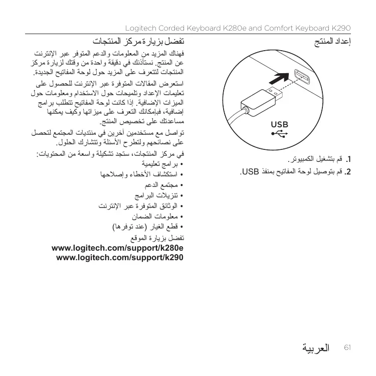 فهناك المزيد من المعلومات والدعم المتوفر عبر اإلنترنت عن المنتج .نستأذنك في دقيقة واحدة من وقتك لزيارة مركز المنتجات لتتعرف على المزيد حول لوحة المفاتيح الجديدة. استعرض المقاالت المتوفرة عبر اإلنترنت للحصول على تعليمات اإلعداد وتلميحات حول االستخدام ومعلومات حول الميزات اإلضافية .إذا كانت لوحة المفاتيح تتطلب برامج إضافية ،فبإمكانك التعرف على ميزاتها وكيف يمكنها مساعدتك على تخصيص المنتج. تواصل مع مستخدمين آخرين في منتديات المجتمع لتحصل على نصائحهم ولتطرح األسئلة وتتشارك الحلول. في مركز المنتجات ،ستجد تشكيلة واسعة من المحتويات: •برامج تعليمية •استكشاف األخطاء وإصالحها •مجتمع الدعم •تنزيالت البرامج •الوثائق المتوفرة عبر اإلنترنت •معلومات الضمان •قطع الغيار (عند توفرها) تفضل بزيارة الموقع www.logitech.com/support/k280e www.logitech.com/support/k290