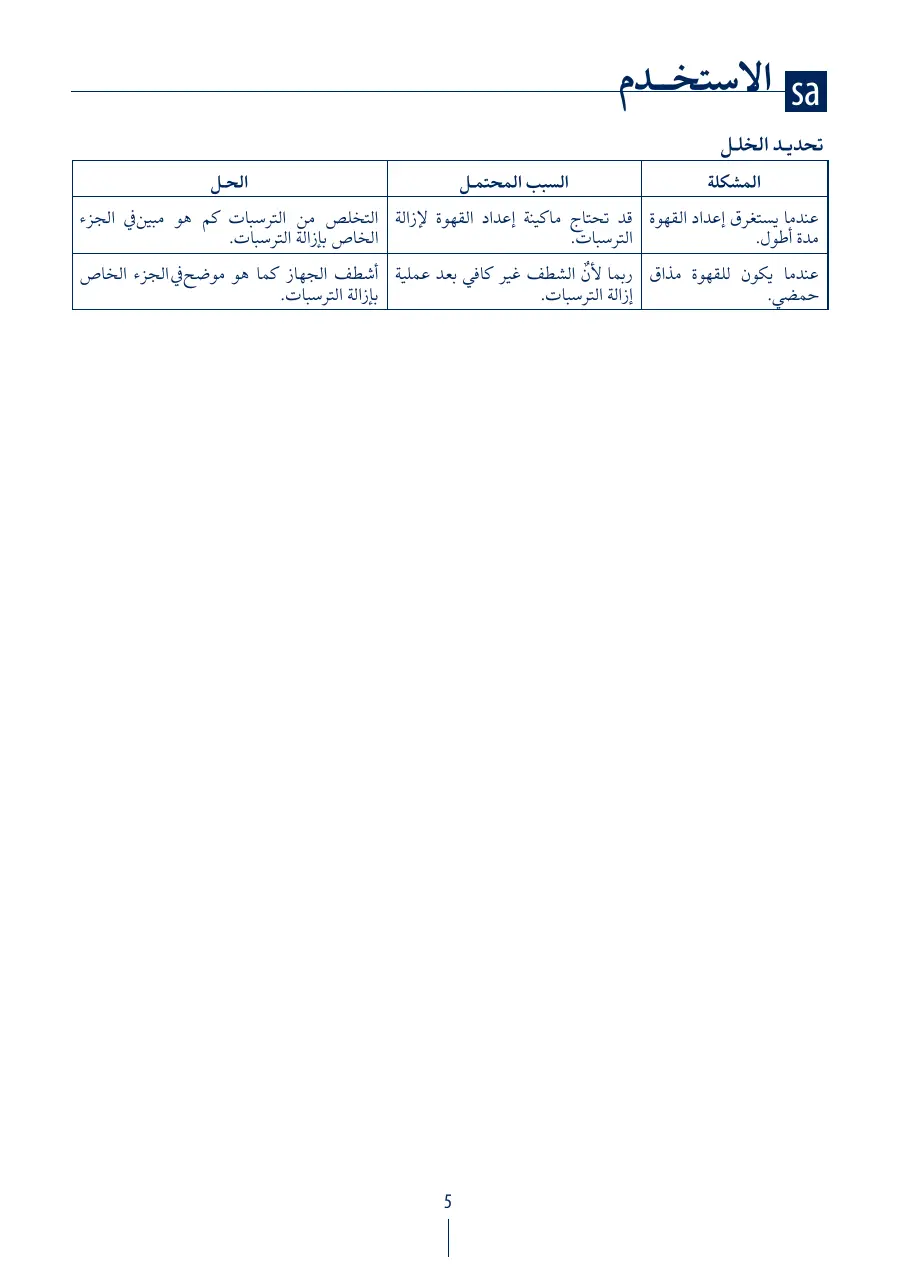عندما يستغرق إعداد القهوة قد تحتاج ماكينة إعداد القهوة إلزالة التخلص من الترسبات كم هو مبينيف الجزء الخاص بإزالة الترسبات. الترسبات. مدة أطول. عندما يکون للقهوة مذاق ربما ٌ ألن الشطف غير كافي بعد عملية أشطف الجهاز كما هو موضحيف الجزء الخاص بإزالة الترسبات. إزالة الترسبات. حمضي.