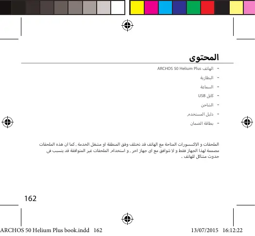 المحتوى 162............................................................................................................... وصف الهاتف 163.......................................................................................................... تهيئة االستخدام166....................................................................................................... بدء االستخدام 168 ....................................................................................................... اتصال البيانات & الشبكة الالسلكية 170.................................................................................. حساب & Googleاالسماء 172............................................................................................ تعليمات االستخدام ™174...................................................................................... Android اكتشاف االخطاء و اصالحها 176.......................................................................................... لمزيد من المعلومات يرجى االطالع على االسئلة الشائعة على موقع االنترنت , www.archos.comيرجى قراءة هذا الدليل قبل االستخدام ,الشركة تقوم بتحديث و تحسين المنتج ,كما ان السوفت وير الموجود فى الهاتف قد يختلف بعض الشئ فى الوظائف و المظهر عن الموجود فى هذا الدليل . ب خيارات الهاتف المذكورة ف الدليل ي ن تنبيه :دليل المستخدم للمرجعية فقط ,قد يوجد اختالف ي ن وب الخيارات الفعلية للهاتف