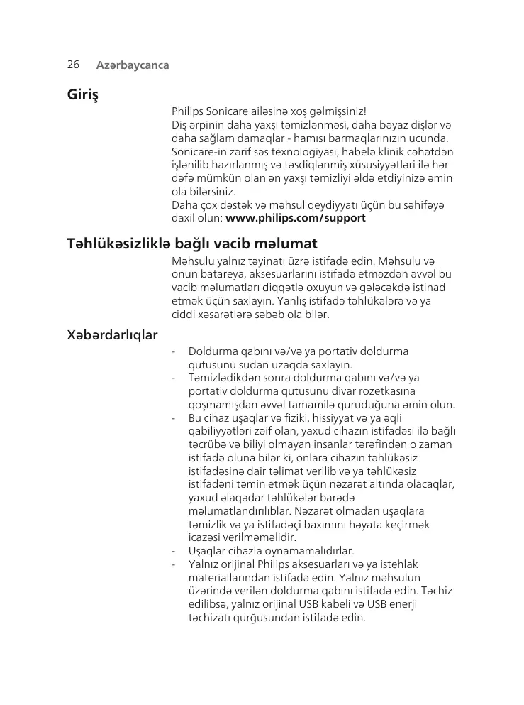 Bu cihazda istifadəçinin təmir edə biləcəyi hissələr yoxdur. Cihaz zədələnibsə, ondan istifadəni dayandırın və ölkənizdəki Müştəriyə Xidmət Mərkəzi ilə əlaqə saxlayın. Kabel zədələnibsə, doldurma qabını yenisinə dəyişdirin. Doldurma qabından və/yaxud portativ doldurma qabından çöldə və ya isti səthlərin yaxınlığında istifadə etməyin. Məhsulun hər hansı hissəsini qabyuyan maşında təmizləməyin. Bu cihaz yalnız dişləri, damağı və dili təmizləmək üçün hazırlanıb. Fırça başlığının xovları zədələnib və ya əyilibsə, ondan istifadəni dayandırın. Köhnəlmə əlamətləri üzə çıxsa, fırça başlığını hər 3 aydan bir və ya daha tez-tez dəyişdirin. Tərkibində efir yağları və ya kokos yağı olan məhsullarla birbaşa təmasdan çəkinin. Bu cür təmas tüklərin yerindən çıxmasına səbəb ola bilər. İstifadədən sonra həddən artıq qanama olsa, qanama 1 həftəlik istifadədən sonra yenə də davam etsə və ya narahatlıq, yaxud ağrı hiss etsəniz, cihazdan istifadəni dayandırın və stomatoloqunuz/həkiminiz ilə məsləhətləşin. Ötən 2 ay ərzində ağız və diş əti əməliyyatı keçirmisinizsə, bu cihazı istifadə etməzdən əvvəl stomatoloqunuz ilə məsləhətləşin. Əgər sizdə kardiostimulyator və ya başqa implantasiya edilmiş cihaz varsa, istifadə etməzdən əvvəl həkiminizlə və ya implantasiya edilmiş cihazın istehsalçısı ilə əlaqə saxlayın. Sağlamlıq problemləriniz varsa, bu cihazı istifadə etməzdən əvvəl həkiminiz ilə məsləhətləşin. Cihaz şəxsi gigiyena cihazıdır və stomatoloji praktikada və ya müəssisədə çoxsaylı xəstələrdə istifadə üçün nəzərdə tutulmayıb.