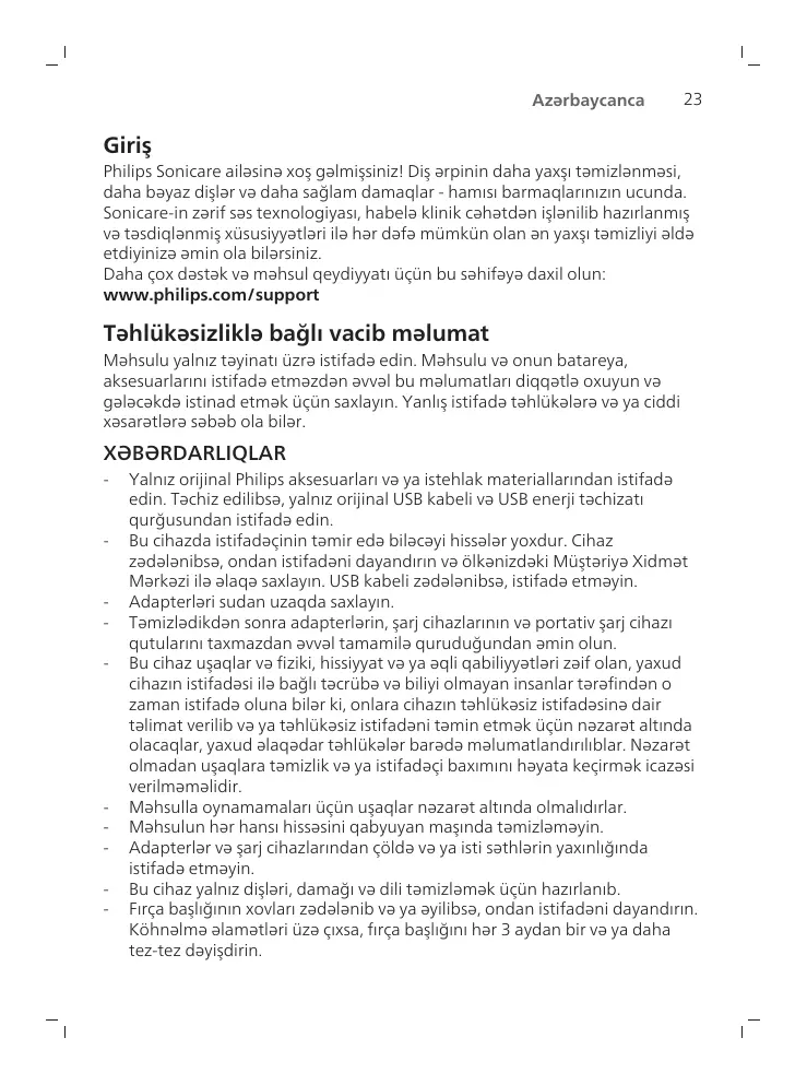 - Consommateurs de votre pays. Si le câble USB est endommagé, cessez de l’utiliser. Gardez les chargeurs à l’écart de l’eau. Après les avoir nettoyés, assurez-vous que les chargeurs et les coffrets de voyage sont complètement secs avant de les brancher. Cet appareil peut être utilisé par des enfants, des personnes dont les capacités physiques, sensorielles ou intellectuelles sont réduites ou des personnes manquant d'expérience et de connaissances, à condition que ces enfants ou personnes soient sous surveillance ou qu'ils aient reçu des instructions quant à l'utilisation sécurisée de l'appareil et qu'ils aient pris connaissance des dangers encourus. Le nettoyage et l'entretien ne doivent pas être effectués par des enfants sans surveillance. Les enfants doivent être surveillés pour s'assurer qu'ils ne s'amusent pas avec le produit. Ne nettoyez aucune pièce du produit au lave-vaisselle. N’utilisez pas les adaptateurs et chargeurs à l’extérieur ou près de surfaces chauffantes. Cet appareil a été conçu uniquement pour le brossage des dents, des gencives et de la langue.
