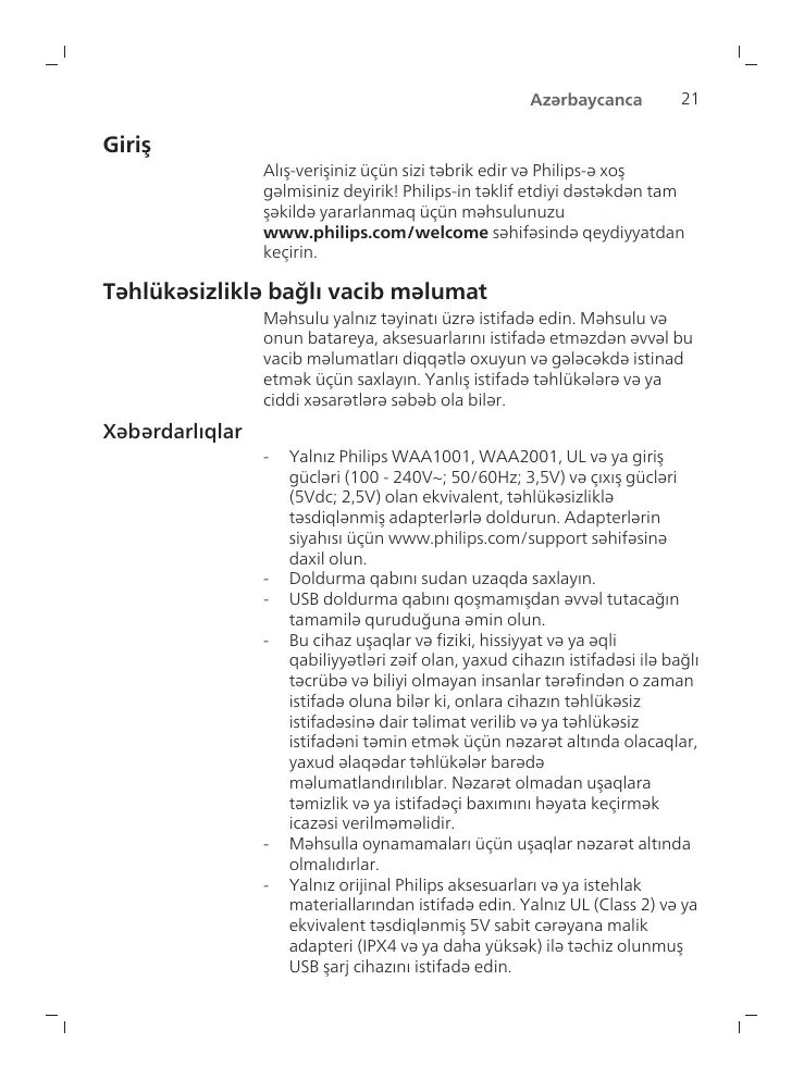 - Utilisez exclusivement des accessoires ou des consommables de la marque Philips. Utilisez uniquement le chargeur USB fourni avec le produit avec un adaptateur SV CC (IPX4 ou supérieur) homologué UL (classe 2) ou équivalent.
