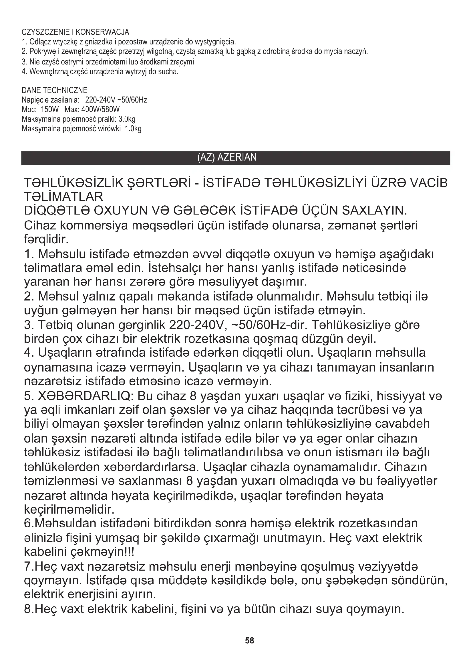 DİQQƏTLƏ OXUYUN VƏ GƏLƏCƏK İSTİFADƏ ÜÇÜN SAXLAYIN. (AZ) AZERIAN15. Cihaz vanna otağında istifadə edildikdə, istifadə etdikdən sonra fişini rozetkadan çıxarın, çünki hətta cihaz söndürüldükdə belə suyun yaxınlığı risk yaradır.