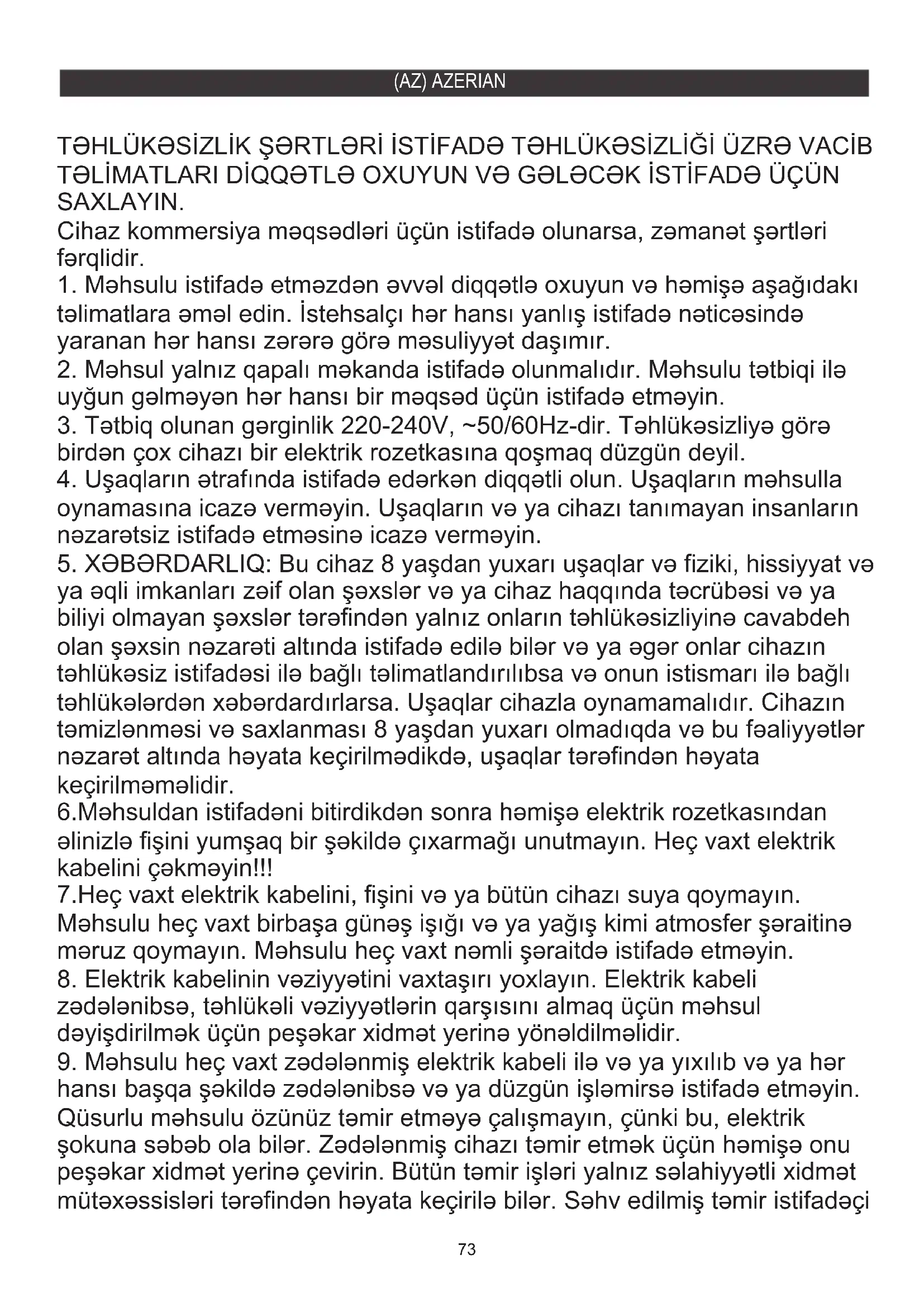 hansı başqa şəkildə zədələnibsə və ya düzgün işləmirsə istifadə etməyin. Qüsurlu məhsulu özünüz təmir etməyə çalışmayın, çünki bu, elektrik şokuna səbəb ola bilər. Zədələnmiş cihazı təmir etmək üçün həmişə onu peşəkar xidmət yerinə çevirin. Bütün təmir işləri yalnız səlahiyyətli xidmət mütəxəssisləri tərəfindən həyata keçirilə bilər. Səhv edilmiş təmir istifadəçi 7.Heç vaxt elektrik kabelini, fişini və ya bütün cihazı suya qoymayın. Məhsulu heç vaxt birbaşa günəş işığı və ya yağış kimi atmosfer şəraitinə məruz qoymayın. Məhsulu heç vaxt nəmli şəraitdə istifadə etməyin.