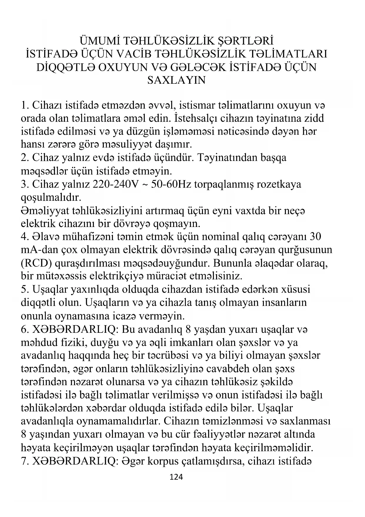 7. XƏBƏRDARLIQ: Əgər korpus çatlamışdırsa, cihazı istifadə125