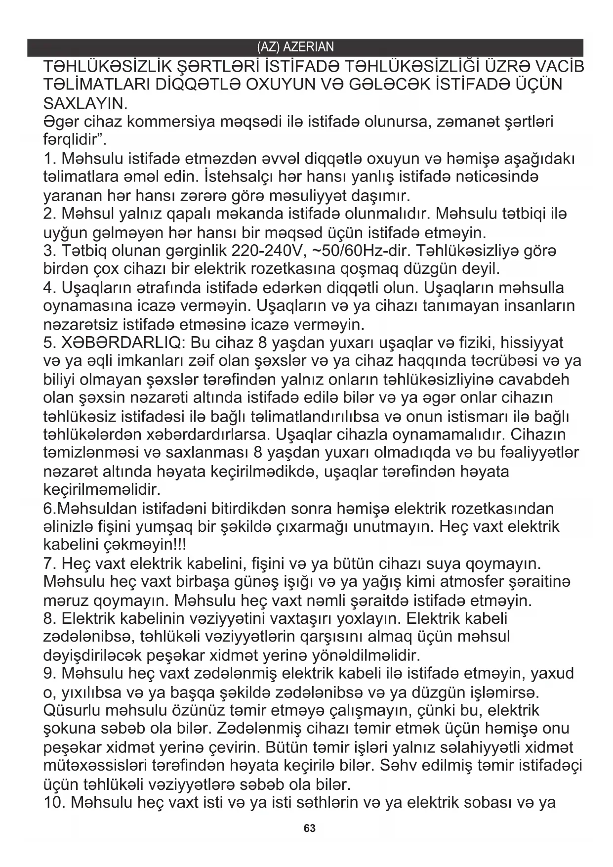 və ya əqli imkanları zəif olan şəxslər və ya cihaz haqqında təcrübəsi və ya biliyi olmayan şəxslər tərəfindən yalnız onların təhlükəsizliyinə cavabdeh olan şəxsin nəzarəti altında istifadə edilə bilər və ya əgər onlar cihazın təhlükəsiz istifadəsi ilə bağlı təlimatlandırılıbsa və onun istismarı ilə bağlı təhlükələrdən xəbərdardırlarsa. Uşaqlar cihazla oynamamalıdır. Cihazın təmizlənməsi və saxlanması 8 yaşdan yuxarı olmadıqda və bu fəaliyyətlər nəzarət altında həyata keçirilmədikdə, uşaqlar tərəfindən həyata keçirilməməlidir. 6.Məhsuldan istifadəni bitirdikdən sonra həmişə elektrik rozetkasından əlinizlə fişini yumşaq bir şəkildə çıxarmağı unutmayın. Heç vaxt elektrik kabelini çəkməyin!!!