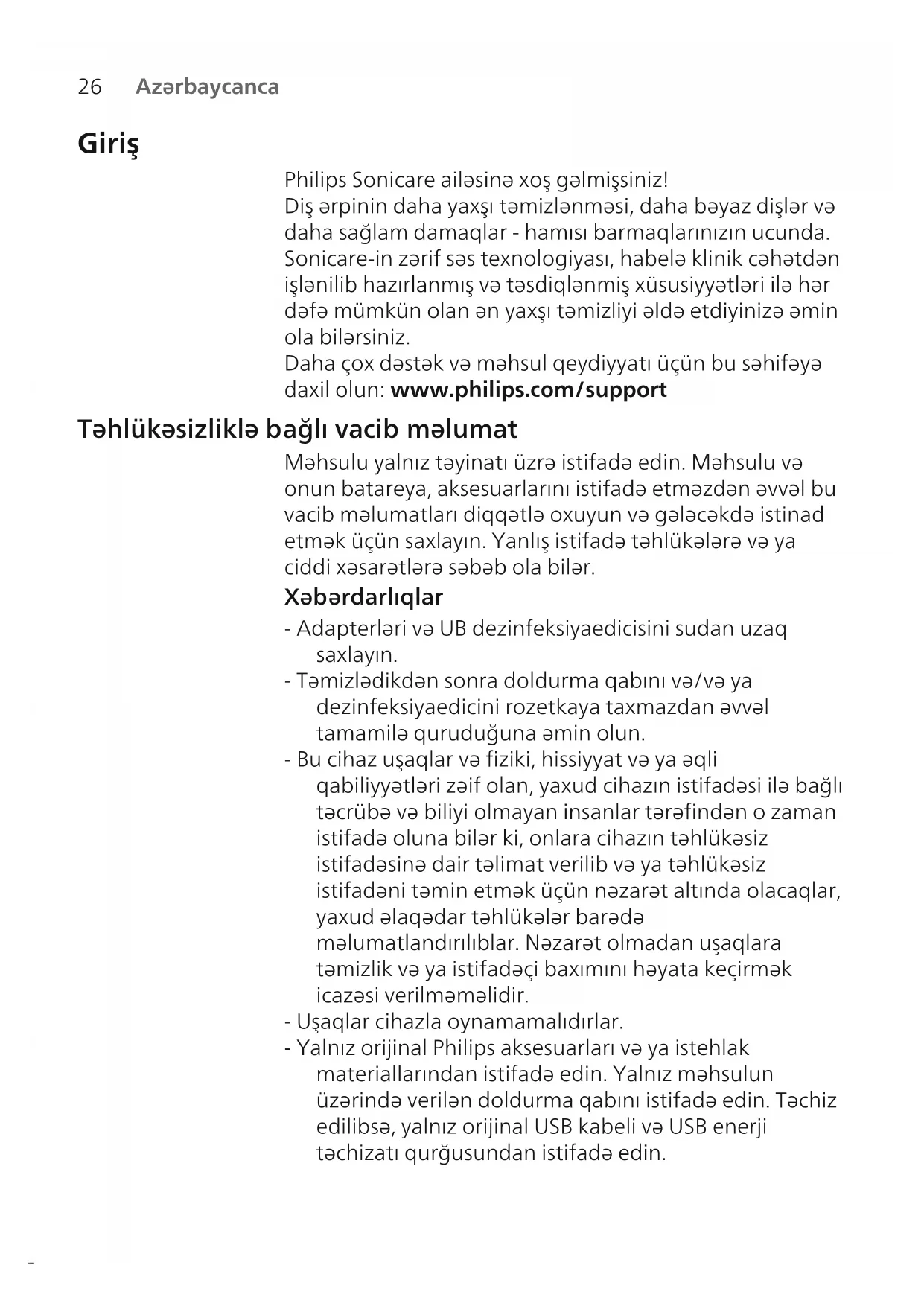 Azərbaycanca Giriş Philips Sonicare ailəsinə xoş gəlmişsiniz! Diş ərpinin daha yaxşı təmizlənməsi, daha bəyaz dişlər və daha sağlam damaqlar - hamısı barmaqlarınızın ucunda. Sonicare-in zərif səs texnologiyası, habelə klinik cəhətdən işlənilib hazırlanmış və təsdiqlənmiş xüsusiyyətləri ilə hər dəfə mümkün olan ən yaxşı təmizliyi əldə etdiyinizə əmin ola bilərsiniz. Daha çox dəstək və məhsul qeydiyyatı üçün bu səhifəyə daxil olun: www.philips.com/support Təhlükəsizliklə bağlı vacib məlumat Məhsulu yalnız təyinatı üzrə istifadə edin. Məhsulu və onun batareya, aksesuarlarını istifadə etməzdən əvvəl bu vacib məlumatları diqqətlə oxuyun və gələcəkdə istinad etmək üçün saxlayın. Yanlış istifadə təhlükələrə və ya ciddi xəsarətlərə səbəb ola bilər. Xəbərdarlıqlar - Adapterləri və UB dezinfeksiyaedicisini sudan uzaq saxlayın. - Təmizlədikdən sonra doldurma qabını və/və ya dezinfeksiyaedicini rozetkaya taxmazdan əvvəl tamamilə quruduğuna əmin olun. - Bu cihaz uşaqlar və fiziki, hissiyyat və ya əqli qabiliyyətləri zəif olan, yaxud cihazın istifadəsi ilə bağlı təcrübə və biliyi olmayan insanlar tərəfindən o zaman istifadə oluna bilər ki, onlara cihazın təhlükəsiz istifadəsinə dair təlimat verilib və ya təhlükəsiz istifadəni təmin etmək üçün nəzarət altında olacaqlar, yaxud əlaqədar təhlükələr barədə məlumatlandırılıblar. Nəzarət olmadan uşaqlara təmizlik və ya istifadəçi baxımını həyata keçirmək icazəsi verilməməlidir. - Uşaqlar cihazla oynamamalıdırlar. - Yalnız orijinal Philips aksesuarları və ya istehlak materiallarından istifadə edin. Yalnız məhsulun üzərində verilən doldurma qabını istifadə edin. Təchiz edilibsə, yalnız orijinal USB kabeli və USB enerji təchizatı qurğusundan istifadə edin.27 Azərbaycanca - Bu cihazda istifadəçinin təmir edə biləcəyi hissələr yoxdur. Cihaz zədələnibsə, ondan istifadəni dayandırın və ölkənizdəki Müştəriyə Xidmət Mərkəzi ilə əlaqə saxlayın. Yalnız şnurlu cihazlar: Şnur zədələnibsə, adapter və ya dezinfeksiyaedicisini yenisi ilə əvəzləyin. - Doldurma qabından və/yaxud dezinfeksiyaedici məhluldan çöldə və ya isti səthlərin yaxınlığında istifadə etməyin. - Məhsulun hər hansı hissəsini qabyuyan maşında təmizləməyin. - Bu cihaz yalnız dişləri, damağı və dili təmizləmək üçün hazırlanıb. - Dezinfeksiyaedici vasitəni həmişə uşaqların əli çatmayan yerdə saxlayın. - Qapı açıq olduqda UB lampası yanırsa, dezinfeksiyaedici vasitədən istifadəni dayandırın. UB lampa şüaları insan gözünə və dərisinə zərər verə bilər. - Dezinfeksiyaedici vasitəni yalnız qoruyucu ekran üçün işlədin. - Qızdıqda UB dezinfeksiyaedicisinin UB lampasına toxunmayın. - Fırça başlığının xovları zədələnib və ya əyilibsə, ondan istifadəni dayandırın. Köhnəlmə əlamətləri üzə çıxsa, fırça başlığını hər 3 aydan bir və ya daha tez-tez dəyişdirin. - Tərkibində efir yağları və ya kokos yağı olan məhsullarla birbaşa təmasdan çəkinin. Bu cür təmas tüklərin yerindən çıxmasına səbəb ola bilər. - İstifadədən sonra həddən artıq qanama olsa, qanama 1 həftəlik istifadədən sonra yenə də davam etsə və ya narahatlıq, yaxud ağrı hiss etsəniz, cihazdan istifadəni dayandırın və stomatoloqunuz/həkiminiz ilə məsləhətləşin. - Ötən 2 ay ərzində ağız və diş əti əməliyyatı keçirmisinizsə, bu cihazı istifadə etməzdən əvvəl stomatoloqunuz ilə məsləhətləşin.28 Azərbaycanca - Əgər sizdə kardiostimulyator və ya başqa implantasiya edilmiş cihaz varsa, istifadə etməzdən əvvəl həkiminizlə və ya implantasiya edilmiş cihazın istehsalçısı ilə əlaqə saxlayın. - Sağlamlıq problemləriniz varsa, bu cihazı istifadə etməzdən əvvəl həkiminiz ilə məsləhətləşin. - Cihaz şəxsi gigiyena cihazıdır və stomatoloji praktikada və ya müəssisədə çoxsaylı xəstələrdə istifadə üçün nəzərdə tutulmayıb. Batareya təhlükəsizliyinə dair təlimatlar - Bu cihazda yalnız təcrübəli şəxslər tərəfindən çıxarılmalı olan batareyalar var - Məhsulu yalnız təyinatı üzrə istifadə edin. Məhsulu və onun batareya, aksesuarlarını istifadə etməzdən əvvəl bu məlumatları diqqətlə oxuyun və gələcəkdə istinad etmək üçün saxlayın. Yanlış istifadə təhlükələrə və ya ciddi xəsarətlərə səbəb ola bilər. Verilən aksesuarlar müxtəlif məhsullar üçün fərqli ola bilər. - Yalnız orijinal Philips aksesuarları və istehlak materiallarından istifadə edin. Yalnız TCBxxxx, HX6100, HX6110, HX6160 və ya WAAxxxx çıxarıla bilən enerji təchizatı blokundan istifadə edin. - Məhsulu və batareyaları oddan uzaq saxlayın və onları birbaşa günəş işığı və ya yüksək temperatura məruz qoymayın. - Məhsul anormal şəkildə qızar və ya qoxu gələrsə, rəngini dəyişər və ya şarj normaldan daha uzun müddət davam edərsə, məhsulu istifadə etməyi, həmçinin şarj etməyi dayandırın və Philips ilə əlaqə saxlayın. - Məhsulları və onların batareyalarını mikrodalğalı soba və ya induksiyalı ocaqlara qoymayın. - Batareyaların qızmaması və ya zəhərli, təhlükəli maddələr buraxmaması üçün məhsulu və ya batareyanı açmayın, dəyişdirməyin, deşməyin, zədələməyin və ya sökməyin. Batareyanın qısa qapanmasına, həddindən artıq və ya əks şarj edilməsinə yol verməyin.29 Azərbaycanca - Bu cihazda təmir oluna bilən hissələr yoxdur. Batareyanın istismar müddəti başa çatdıqda, cihaz lazımi qaydada atılmalıdır (təkrar emal bölməsinə baxın). - Batareyalar zədələnərsə və ya sızdırarsa, onların dəri və ya gözlə