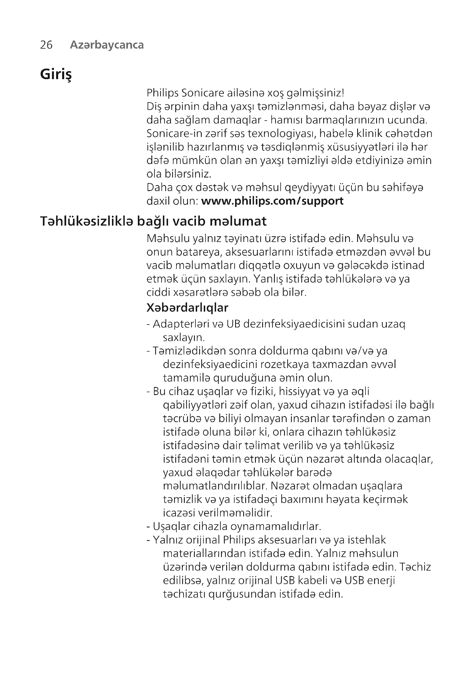 Azərbaycanca Giriş Philips Sonicare ailəsinə xoş gəlmişsiniz! Diş ərpinin daha yaxşı təmizlənməsi, daha bəyaz dişlər və daha sağlam damaqlar - hamısı barmaqlarınızın ucunda. Sonicare-in zərif səs texnologiyası, habelə klinik cəhətdən işlənilib hazırlanmış və təsdiqlənmiş xüsusiyyətləri ilə hər dəfə mümkün olan ən yaxşı təmizliyi əldə etdiyinizə əmin ola bilərsiniz. Daha çox dəstək və məhsul qeydiyyatı üçün bu səhifəyə daxil olun: www.philips.com/support Təhlükəsizliklə bağlı vacib məlumat Məhsulu yalnız təyinatı üzrə istifadə edin. Məhsulu və onun batareya, aksesuarlarını istifadə etməzdən əvvəl bu vacib məlumatları diqqətlə oxuyun və gələcəkdə istinad etmək üçün saxlayın. Yanlış istifadə təhlükələrə və ya ciddi xəsarətlərə səbəb ola bilər. Xəbərdarlıqlar - Adapterləri və UB dezinfeksiyaedicisini sudan uzaq saxlayın. - Təmizlədikdən sonra doldurma qabını və/və ya dezinfeksiyaedicini rozetkaya taxmazdan əvvəl tamamilə quruduğuna əmin olun. - Bu cihaz uşaqlar və fiziki, hissiyyat və ya əqli qabiliyyətləri zəif olan, yaxud cihazın istifadəsi ilə bağlı təcrübə və biliyi olmayan insanlar tərəfindən o zaman istifadə oluna bilər ki, onlara cihazın təhlükəsiz istifadəsinə dair təlimat verilib və ya təhlükəsiz istifadəni təmin etmək üçün nəzarət altında olacaqlar, yaxud əlaqədar təhlükələr barədə məlumatlandırılıblar. Nəzarət olmadan uşaqlara təmizlik və ya istifadəçi baxımını həyata keçirmək icazəsi verilməməlidir. - Uşaqlar cihazla oynamamalıdırlar. - Yalnız orijinal Philips aksesuarları və ya istehlak materiallarından istifadə edin. Yalnız məhsulun üzərində verilən doldurma qabını istifadə edin. Təchiz edilibsə, yalnız orijinal USB kabeli və USB enerji təchizatı qurğusundan istifadə edin.27 Azərbaycanca - Bu cihazda istifadəçinin təmir edə biləcəyi hissələr yoxdur. Cihaz zədələnibsə, ondan istifadəni dayandırın və ölkənizdəki Müştəriyə Xidmət Mərkəzi ilə əlaqə saxlayın. Yalnız şnurlu cihazlar: Şnur zədələnibsə, adapter və ya dezinfeksiyaedicisini yenisi ilə əvəzləyin. - Doldurma qabından və/yaxud dezinfeksiyaedici məhluldan çöldə və ya isti səthlərin yaxınlığında istifadə etməyin. - Məhsulun hər hansı hissəsini qabyuyan maşında təmizləməyin. - Bu cihaz yalnız dişləri, damağı və dili təmizləmək üçün hazırlanıb. - Dezinfeksiyaedici vasitəni həmişə uşaqların əli çatmayan yerdə saxlayın. - Qapı açıq olduqda UB lampası yanırsa, dezinfeksiyaedici vasitədən istifadəni dayandırın. UB lampa şüaları insan gözünə və dərisinə zərər verə bilər. - Dezinfeksiyaedici vasitəni yalnız qoruyucu ekran üçün işlədin. - Qızdıqda UB dezinfeksiyaedicisinin UB lampasına toxunmayın. - Fırça başlığının xovları zədələnib və ya əyilibsə, ondan istifadəni dayandırın. Köhnəlmə əlamətləri üzə çıxsa, fırça başlığını hər 3 aydan bir və ya daha tez-tez dəyişdirin. - Tərkibində efir yağları və ya kokos yağı olan məhsullarla birbaşa təmasdan çəkinin. Bu cür təmas tüklərin yerindən çıxmasına səbəb ola bilər. - İstifadədən sonra həddən artıq qanama olsa, qanama 1 həftəlik istifadədən sonra yenə də davam etsə və ya narahatlıq, yaxud ağrı hiss etsəniz, cihazdan istifadəni dayandırın və stomatoloqunuz/həkiminiz ilə məsləhətləşin. - Ötən 2 ay ərzində ağız və diş əti əməliyyatı keçirmisinizsə, bu cihazı istifadə etməzdən əvvəl stomatoloqunuz ilə məsləhətləşin.28 Azərbaycanca - Əgər sizdə kardiostimulyator və ya başqa implantasiya edilmiş cihaz varsa, istifadə etməzdən əvvəl həkiminizlə və ya implantasiya edilmiş cihazın istehsalçısı ilə əlaqə saxlayın. - Sağlamlıq problemləriniz varsa, bu cihazı istifadə etməzdən əvvəl həkiminiz ilə məsləhətləşin. - Cihaz şəxsi gigiyena cihazıdır və stomatoloji praktikada və ya müəssisədə çoxsaylı xəstələrdə istifadə üçün nəzərdə tutulmayıb. Batareya təhlükəsizliyinə dair təlimatlar - Bu cihazda yalnız təcrübəli şəxslər tərəfindən çıxarılmalı olan batareyalar var - Məhsulu yalnız təyinatı üzrə istifadə edin. Məhsulu və onun batareya, aksesuarlarını istifadə etməzdən əvvəl bu məlumatları diqqətlə oxuyun və gələcəkdə istinad etmək üçün saxlayın. Yanlış istifadə təhlükələrə və ya ciddi xəsarətlərə səbəb ola bilər. Verilən aksesuarlar müxtəlif məhsullar üçün fərqli ola bilər. - Yalnız orijinal Philips aksesuarları və istehlak materiallarından istifadə edin. Yalnız TCBxxxx, HX6100, HX6110, HX6160 və ya WAAxxxx çıxarıla bilən enerji təchizatı blokundan istifadə edin. - Məhsulu və batareyaları oddan uzaq saxlayın və onları birbaşa günəş işığı və ya yüksək temperatura məruz qoymayın. - Məhsul anormal şəkildə qızar və ya qoxu gələrsə, rəngini dəyişər və ya şarj normaldan daha uzun müddət davam edərsə, məhsulu istifadə etməyi, həmçinin şarj etməyi dayandırın və Philips ilə əlaqə saxlayın. - Məhsulları və onların batareyalarını mikrodalğalı soba və ya induksiyalı ocaqlara qoymayın. - Batareyaların qızmaması və ya zəhərli, təhlükəli maddələr buraxmaması üçün məhsulu və ya batareyanı açmayın, dəyişdirməyin, deşməyin, zədələməyin və ya sökməyin. Batareyanın qısa qapanmasına, həddindən artıq və ya əks şarj edilməsinə yol verməyin.29 Azərbaycanca - Bu cihazda təmir oluna bilən hissələr yoxdur. Batareyanın istismar müddəti başa çatdıqda, cihaz lazımi qaydada atılmalıdır (təkrar emal bölməsinə baxın). - Batareyalar zədələnərsə və ya sızdırarsa, onların dəri və ya gözlə