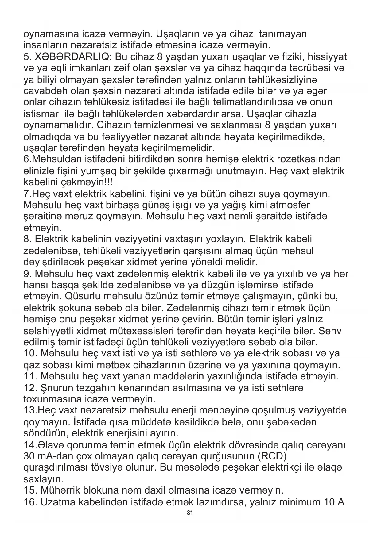 və ya əqli imkanları zəif olan şəxslər və ya cihaz haqqında təcrübəsi və ya biliyi olmayan şəxslər tərəfindən yalnız onların təhlükəsizliyinə cavabdeh olan şəxsin nəzarəti altında istifadə edilə bilər və ya əgər onlar cihazın təhlükəsiz istifadəsi ilə bağlı təlimatlandırılıbsa və onun istismarı ilə bağlı təhlükələrdən xəbərdardırlarsa. Uşaqlar cihazla oynamamalıdır. Cihazın təmizlənməsi və saxlanması 8 yaşdan yuxarı olmadıqda və bu fəaliyyətlər nəzarət altında həyata keçirilmədikdə, uşaqlar tərəfindən həyata keçirilməməlidir. 6.Məhsuldan istifadəni bitirdikdən sonra həmişə elektrik rozetkasından əlinizlə fişini yumşaq bir şəkildə çıxarmağı unutmayın. Heç vaxt elektrik kabelini çəkməyin!!! 7.Heç vaxt elektrik kabelini, fişini və ya bütün cihazı suya qoymayın. Məhsulu heç vaxt birbaşa günəş işığı və ya yağış kimi atmosfer şəraitinə məruz qoymayın. Məhsulu heç vaxt nəmli şəraitdə istifadə etməyin.