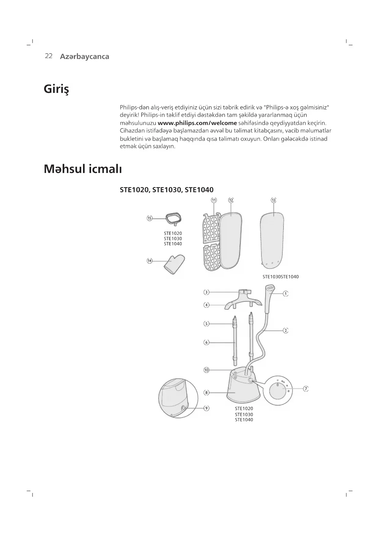 1 Buxar başlığı 2 Buxar təchizatı şlanqı 3 Buxar ucluğu 4 Asılqan (STE1011, STE1020, STE1030, STE1040) 5 Dayaq kilidi qısqacı 6 Dayaq 7 Buxar vermə tənzimləyicisi 8 Baza 9 Ərp təmizləmə klapanı 10 Su çəni24 Azərbaycanca 11 Lövhə (STE1040) 12 Örtük (STE1040) 13 Altlıq (STE1030) 14 Əlcək 15 Fırça (STE1020, STE1030, STE1040) İstifadəyə hazırlanır İstifadə olunacaq suyun növü Cihazı kran suyu ilə istifadə etmək tövsiyə edilir. Ancaq sərt suyu olan bölgədə yaşayırsınızsa, bərabər miqdarda kran suyunu distillə edilmiş və ya mineraldan təmizlənmiş su ilə qarışdırmağı məsləhət görürük. Bu, ərpin toplanmasının qarşısını alacaq və cihazın istismar müddətini uzadacaq. Ətir, su, qurutma maşınından götürülmüş su, sirkə, nişasta, ərp təmizləyici vasitələr, ütüləmə vasitələri, kimyəvi təmizlənmiş su və ya digər kimyəvi maddələrdən istifadə etməyin, çünki onlar su damcılamasına, qəhvəyi rəngli ləkələnməyə və ya cihazınızın zədələnməsinə səbəb ola bilər. Xəbərdarlıqlar 1 Dərinin heç bir hissəsini buxarla birbaşa təmas etdirməyin. 2 Buxar plitəsini başqa insanlara tərəf tutmayın.25 Azərbaycanca 3 Paltarınızı birbaşa buxara məruz qalacaq şəkildə tutmayın. 4 Buxar başlığını aşağıya doğru tutaraq istifadə etməyin. 5 Paltara buxar vurmaq üçün şlanqı əyməyin. > 5 min. 6 Buxar ütüsünü 5 dəqiqədən artıq nəzarətsiz qoymayın.26 Azərbaycanca