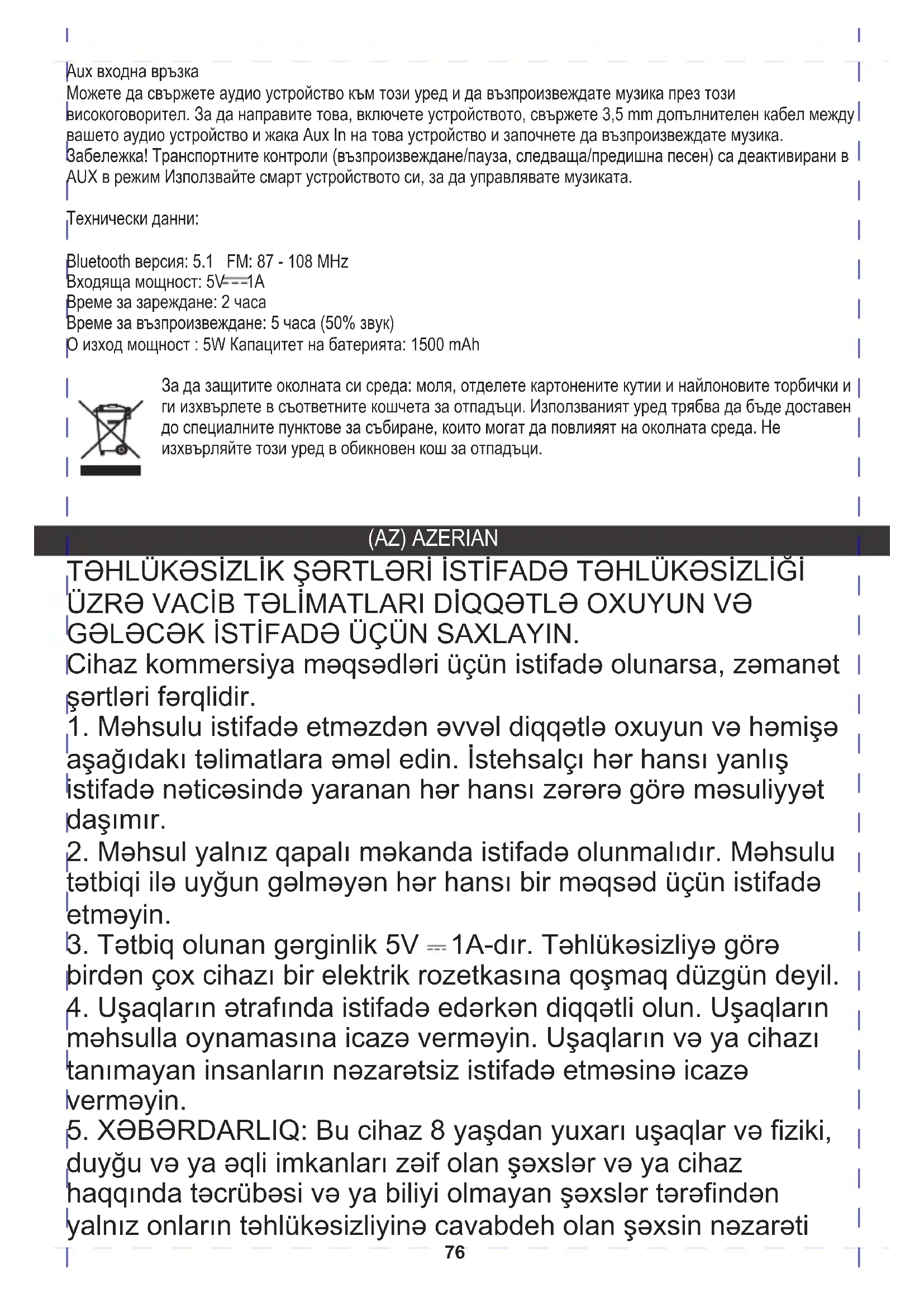 üçün Play/Pause düyməsini (3) yenidən basın. Qeyd: Cihaz son qoşulmuş cihazı oxuyacaq. Başqa bir cihazı oxuyarkən başqa bir cihaz daxil etsəniz, cihaz oxutmanı dayandıracaq və sonuncu daxil edilmiş cihazı oxumağa başlayacaq. Aux Giriş Bağlantısı Siz audio cihazını bu qurğuya qoşa və musiqinizi bu dinamik vasitəsilə səsləndirə bilərsiniz. Bunu etmək üçün cihazı yandırın, audio cihazınız arasında 3,5 mm-lik köməkçi kabeli bu cihazın Aux In Jack-ə qoşun və musiqi çalmağa başlayın. Qeyd! Nəqliyyat nəzarətləri (oyun/fasilə, növbəti/əvvəlki trek) AUX rejimində deaktiv edilib Musiqiyə nəzarət etmək üçün ağıllı cihazınızdan istifadə edin. Texniki məlumat: Bluetooth versiyası: 5.1 FM: 87 - 108 MHz Giriş gücü: 5V 1A Doldurma müddəti: 2 saat Oxuma vaxtı: 5 saat (50% səs) O çıxış güc : 5W Akkumulyatorun tutumu: 1500 mAh Ətraf mühiti qorumaq üçün: kartonları və plastik torbaları ayırın və müvafiq tullantı qablarına qoyun. İstifadə olunmuş cihaz ətraf mühitə təsir göstərə bilən xüsusi toplama məntəqələrinə çatdırılmalıdır. Bu cihazı adi zibilliyə atmayın. KUSHTET E SIGURISË UDHËZIME TË RËNDËSISHME MBI SIGURINË E PËRDORIMIT JU LUTEM LEXONI ME KUJDES DHE MBANI PËR REFERENCA TË ARDHSHME Kushtet e garancisë janë të ndryshme, nëse pajisja përdoret për qëllime komerciale. 1.Para se të përdorni produktin ju lutemi lexoni me kujdes dhe ndiqni gjithmonë udhëzimet e mëposhtme. Prodhuesi nuk mban përgjegjësi për ndonjë dëmtim për shkak të ndonjë keqpërdorimi.