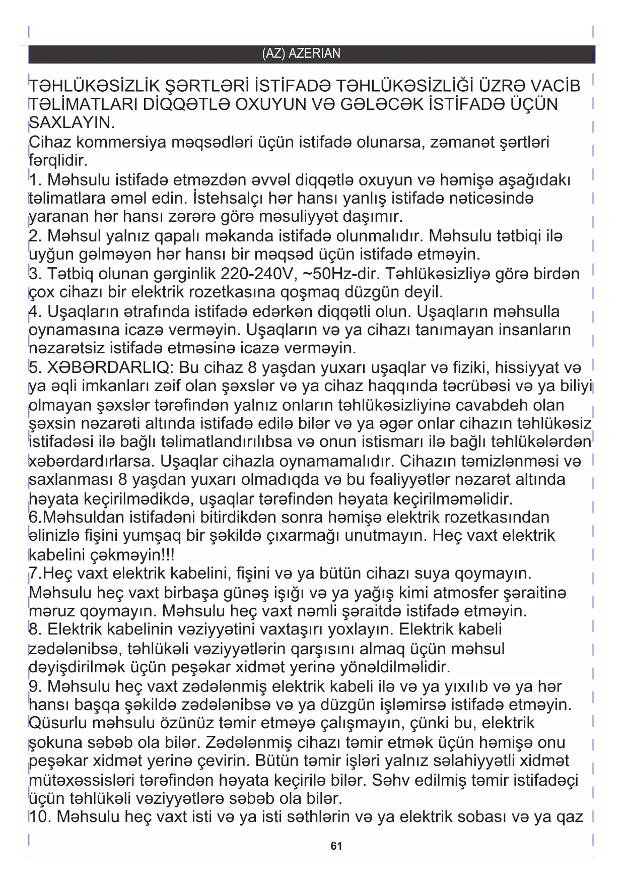 - XƏBƏRDARLIQ: Bu cihaz 8 yaşdan yuxarı uşaqlar və fiziki, hissiyyat və ya əqli imkanları zəif olan şəxslər və ya cihaz haqqında təcrübəsi və ya biliyi olmayan şəxslər tərəfindən yalnız onların təhlükəsizliyinə cavabdeh olan şəxsin nəzarəti altında istifadə edilə bilər və ya əgər onlar cihazın təhlükəsiz istifadəsi ilə bağlı təlimatlandırılıbsa və onun istismarı ilə bağlı təhlükələrdən xəbərdardırlarsa. Uşaqlar cihazla oynamamalıdır. Cihazın təmizlənməsi və saxlanması 8 yaşdan yuxarı olmadığıda və bu fəaliyyətlər nəzarət altında həyata keçirilmədikdə, uşaqlar tərəfindən həyata keçirilməməlidir.