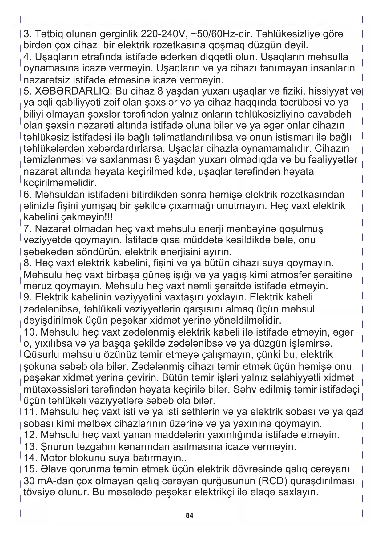 təlimatlara əməl edin. İstehsalçı hər hansı yanlış istifadə nəticəsində yaranan hər hansı zərərə görə məsuliyyət daşımır. DİQQƏTLƏ OXUYUN VƏ GƏLƏCƏK İSTİFADƏ ÜÇÜN SAXLAYIN. Cihaz kommersiya məqsədləri üçün istifadə olunarsa, zəmanət şərtləri fərqlidir.