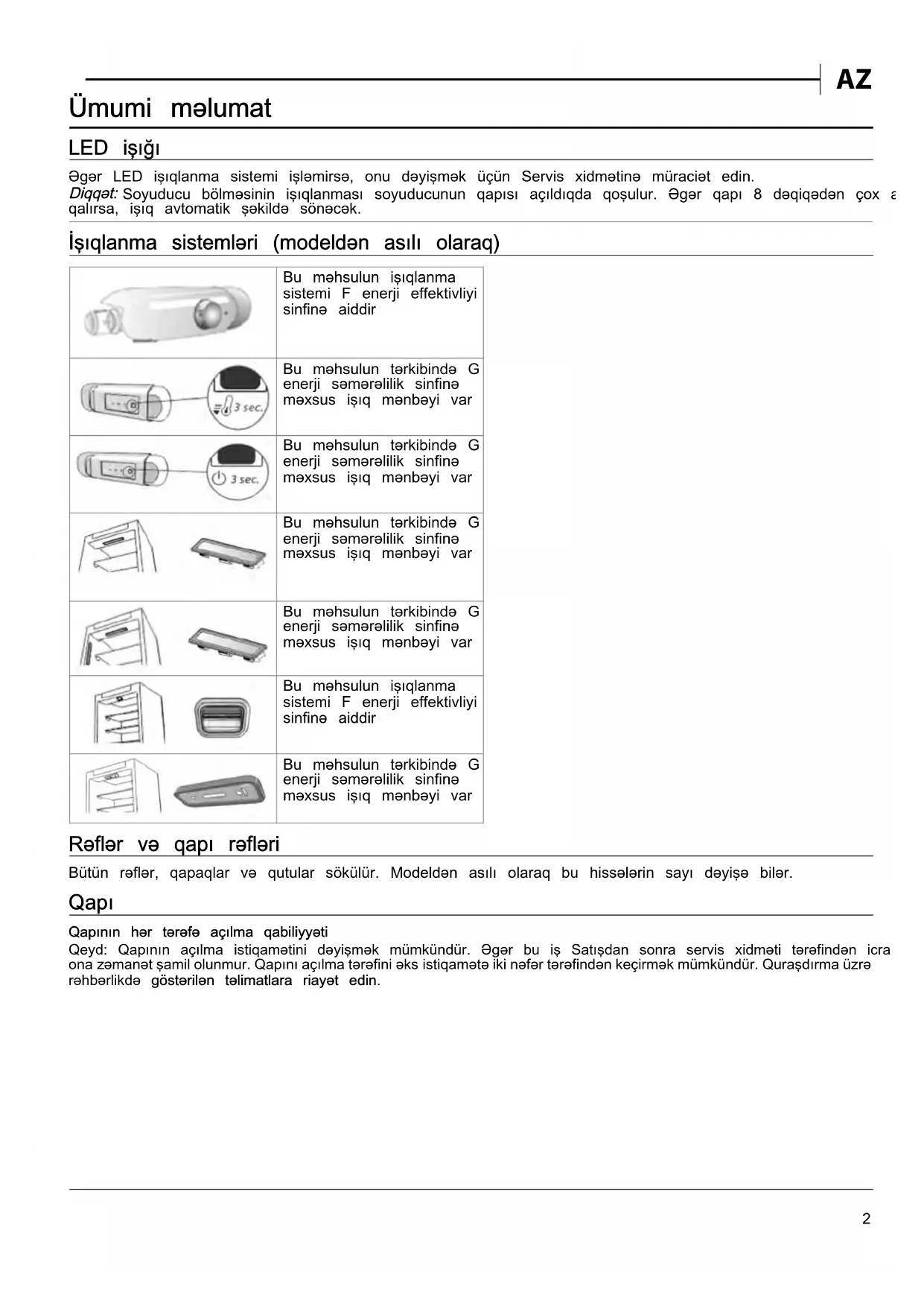 Ümumi məlumat LED işığı Əgər LED işıqlanma sistemi işləmirsə, onu dəyişmək üçün Servis xidmətinə müraciət edin. Diqqət: Soyuducu bölməsinin işıqlanması soyuducunun qapısı açıldıqda qoşulur. Əgər qapı 8 dəqiqədən çox açıq qalırsa, işıq avtomatik şəkildə sönəcək. İşıqlanma sistemləri (modeldən asılı olaraq) Bu məhsulun işıqlanma sistemi F enerji effektivliyi sinfinə aiddir Bu məhsulun tərkibində G enerji səmərəlilik sinfinə məxsus işıq mənbəyi var Bu məhsulun tərkibində G enerji səmərəlilik sinfinə məxsus işıq mənbəyi var Bu məhsulun tərkibində G enerji səmərəlilik sinfinə məxsus işıq mənbəyi var Bu məhsulun tərkibində G enerji səmərəlilik sinfinə məxsus işıq mənbəyi var Bu məhsulun işıqlanma sistemi F enerji effektivliyi sinfinə aiddir Bu məhsulun tərkibində G enerji səmərəlilik sinfinə məxsus işıq mənbəyi var Rəflər və qapı rəfləri Bütün rəflər, qapaqlar və qutular sökülür. Modeldən asılı olaraq bu hissələrin sayı dəyişə bilər. Qapı Qapının hər tərəfə açılma qabiliyyətiQeyd: Qapının açılma istiqamətini dəyişmək mümkündür. Əgər bu iş Satışdan sonra servis xidməti tərəfindən icra olunursa, ona zəmanət şamil olunmur. Qapını açılma tərəfini əks istiqamətə iki nəfər tərəfindən keçirmək mümkündür. Quraşdırma üzrə rəhbərlikdə göstərilən təlimatlara riayət edin.3 Cihazdan necə istifadə etmək İlk dəfə istifadə etdikdə Soyuducunu quraşdırdıqdan sonra onu elektrik şəbəkəsinə qoşmazdan əvvəl ən azı iki saat gözləyin. Qoşduqdan sonra soyuducu avtomatik şəkildə işləməyə başlayacaq. Mükəmməl temperatur göstəriciləri istehsalçı zavodda ilkin nizamlanıbdır. Soyuducunu elektrik şəbəkəsinə qoşduqdan sonra düzgün qida saxlanma temperaturunu yığmaq üçün ən azı 4-6 saat gözləyin. Soyuducu bölməsi və qida məhsullarının saxlanması Soyuducu bölməsində təzə qida məhsullarını və içkiləri saxlamaq mümkündür. Soyuducu bölməsinin donu tam avtomatik şəkildə açılır. Bölmənin daxili arxa divarında vaxtaşırı yaranan su damlaları avtomatik donun açılma mərhələsinin göstəricisidir. Don açılan zaman yaranan su drenaj vasitəsi ilə xüsusi qaba yönəldilir, orada yığılır və oradan buxarlanma yolu ilə xaric olunur. Qeyd: ətraf temperatur, qapıların hansı tezliklə açılıb bağlanması, cihazın yerləşdiyi yer iki bölmənin daxili temperaturuna təsir göstərə bilər. Bu amillərdən asılı olaraq temperatur ölçüləri quraşdırılır. Yüksək rütubətli yerlərdə soyuducu bölməsində kondensasiya hallarına, ələlxüsus şüşə rəflərdə rast gəlmək mümkündür. Belə hallarda soyuducuda saxlanılan maye olan qabların ağzını (məsələn, qaznaları) bağlamaq, yüksək su tərkibli qida məhsullarını (məsələn tərəvəzləri) qablaşdırmaq və, əgər varsa, ventilyatoru qoşmaq tövsiyə olunur. Bütün siyirtmələr, qapı rəfləri və rəflər sökülə bilər. Hava dövriyyəsi Soyuducu bölmənin içində havanın təbii dövriyyəsi müxtəlif temperaturlu zonaların yaranmasına gətirib çıxarır. Kifayət qədər ventilyasiya olmayan zaman enerji sərfiyyəti artır, soyuducunun məhsuldarlığı azalır. Təzə qida məhsullarını və içkiləri necə saxlamaq Böyük miqdarda etilen qazı ifraz edən qida məhsulların (almalar, əriklər, armudlar, şaftalılar, avokadolar, əncirlər, gavalılar, qaragilələrt, yemişlər, paxlalar) və bu qazın təsirinə həssas meyvə, tərəvəz və salat kimi ərzaqların saxlanma müddəti kifayət qədər uzun olsun deyə, onları ayrıca və ya qablaşdırılmış halda saxlamaq lazımdır; məsələn, pomidorları kivi və ya kələmlə birgə saxlamaq olmaz. Havanın daha yaxşı dövr etməsi üçün ğrzaqları sıx yerləşdirmək məsləhət deyil. Ərzaqları saxlamaq üçün təkrar istifadə üçün yararlı plastik, alümin və şüşə qablardan, qablaşma plyonkasından istifadə edin. Əgər soyuducuda kiçik həcmli ərzaqların saxlanması lazımdırsa, meyvə və tərəvəz siyirtmələrinin üstündə yerləşən rəfdən istifadə etmək məsləhətdir, çünki bu rəf soyuducu bölməsinin ən soyuq yeridir. Mayelərin və ya qoxusu yaxud ətri olan ərzaqları saxlanması üçün həmişə qapalı qablardan istifadə edin və ya sadəcə üstlərini örtun. Butulkaların düşməsinin qarşısını almaq üçün butulka tutuculardan (bəzi modellərdə mövcuddur) istifadə edin. Dondurucu bölməsi və qidanın saxlanması Dondurucu bölməsinin köməyi ilə donmuş qida məhsulları saxlanılır, təzə qida məhsulları dondurulur. Müəyyən vaxt intervalında saxlanıla bilən təzə qida məhsulların həcmi göstəricilər lövhəciyində göstərilib. Təzə qida məhsullarını dondurucu bölmədə elə yerləşdirin ki, havanın maneəsiz dövr etməsi üçün onların ətrafında kifayət qədər yer olsun. Təzə qida ilə donmuş qida arasında təmas olmamalıdır. Yük limitləri səbət, qapaq, siyirtmə, rəflər və s. təyin edilir. Soyuducunun bu hissələrini yüklədikdən sonra onların kip bağlanmasına diqqət yetirin. Dondurma sürətini optimallaşdırmaq və daha çox saxlanma yerini əldə etmək üçün, dondurucu bölmədən siyirtmələri çıxarmaq mümkündür. Dondurucunun siyirtmə qabının çıxarılması