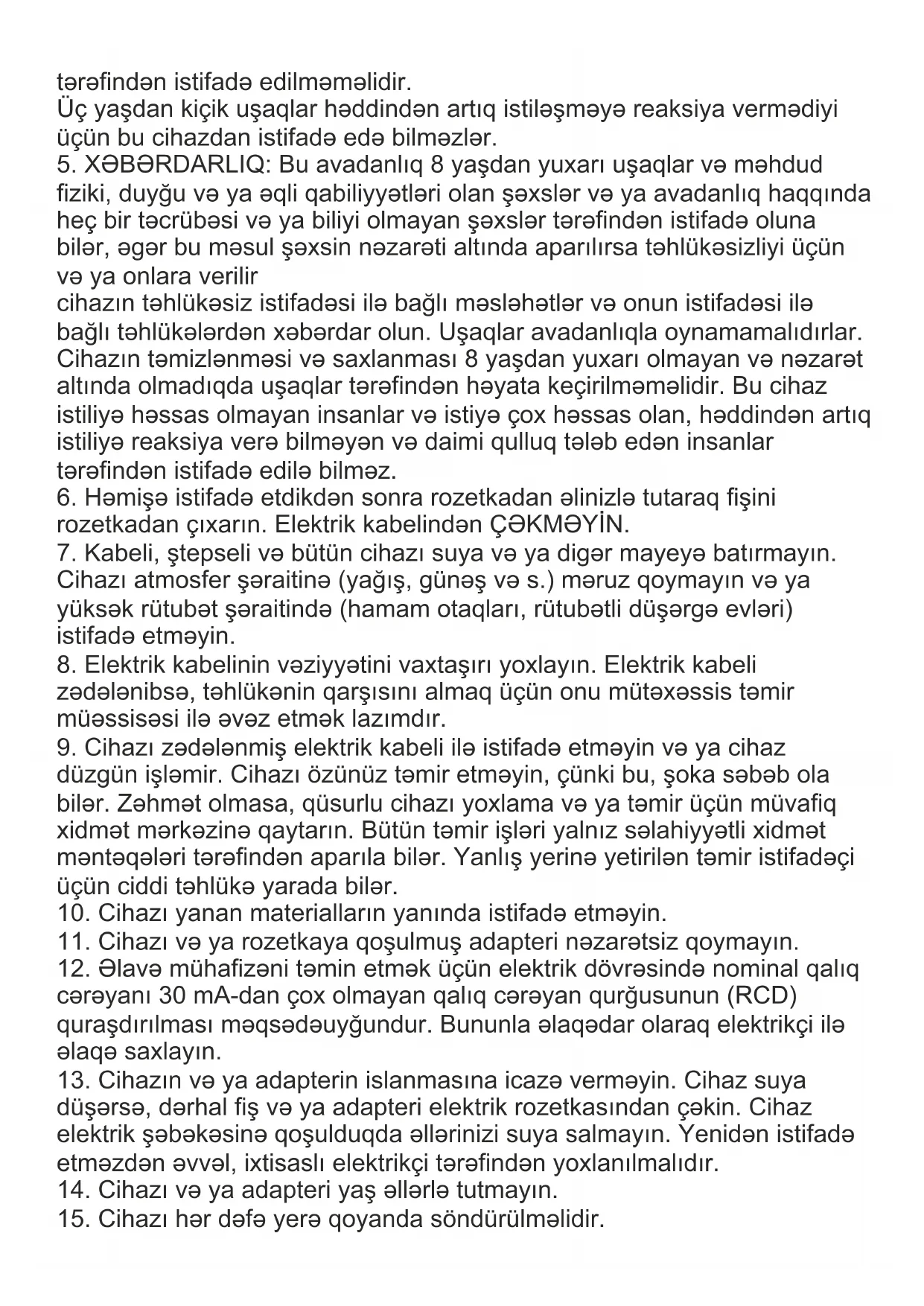 15. Cihazı hər dəfə yerə qoyanda söndürülməlidir.16. Cihazı suyun yanında istifadə etməyin, məsələn: duşda, küvetdə və ya su ilə hövzənin üstündə.