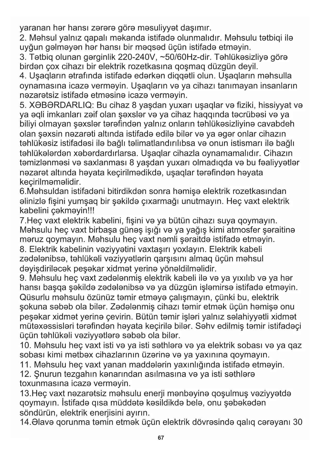 təlimatlara əməl edin. İstehsalçı hər hansı yanlış istifadə nəticəsində (AZ) AZERIAN67 14.Əlavə qorunma təmin etmək üçün elektrik dövrəsində qalıq cərəyanı 30 13.Heç vaxt nəzarətsiz məhsulu enerji mənbəyinə qoşulmuş vəziyyətdə qoymayın. İstifadə qısa müddətə kəsildikdə belə, onu şəbəkədən söndürün, elektrik enerjisini ayırın.
