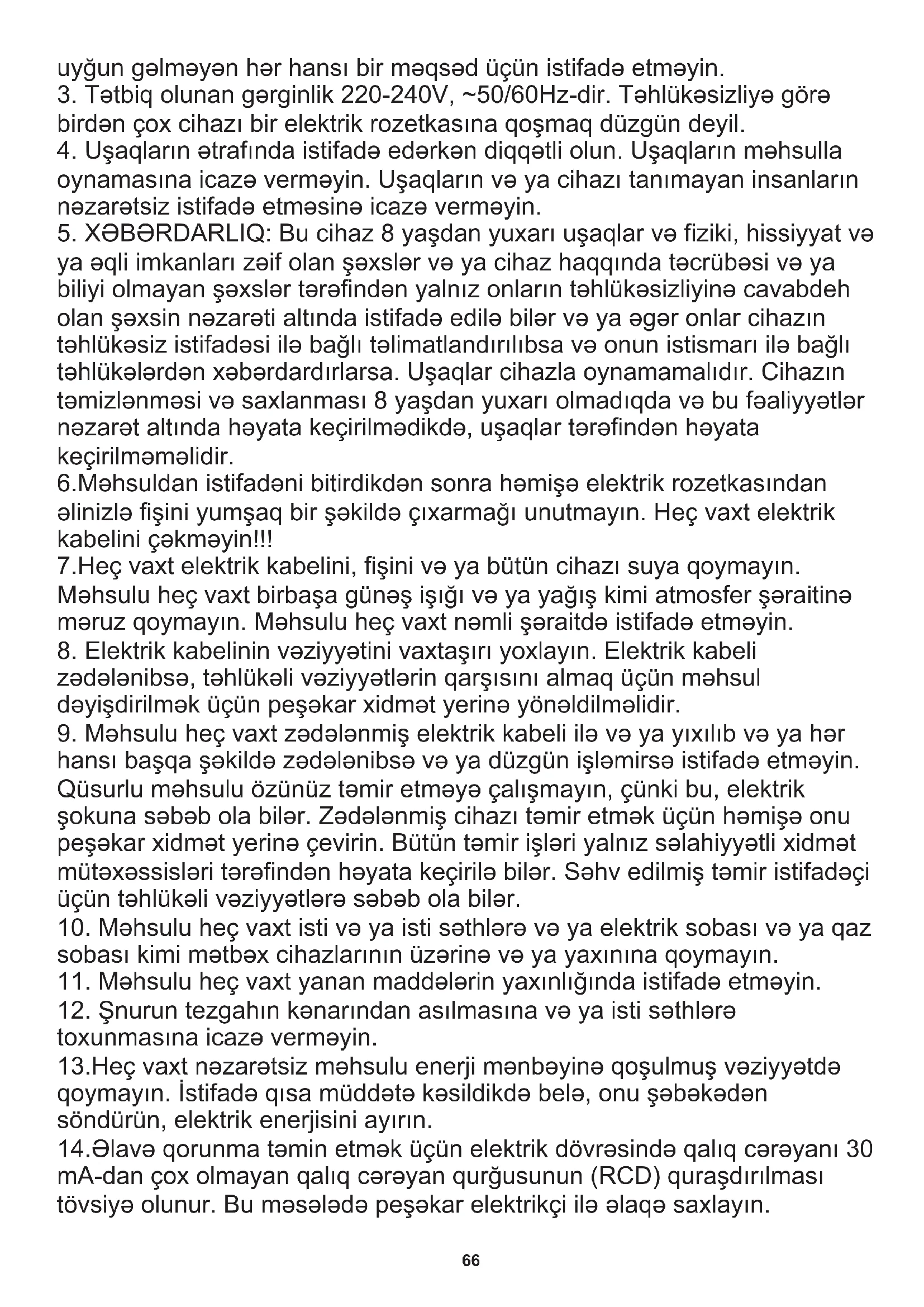 təlimatlara əməl edin. İstehsalçı hər hansı yanlış istifadə nəticəsində yaranan hər hansı zərərə görə məsuliyyət daşımır. Əgər cihaz kommersiya məqsədi ilə istifadə olunursa, zəmanət şərtləri fərqlidir”. TƏHLÜKƏSİZLİK ŞƏRTLƏRİ İSTİFADƏ TƏHLÜKƏSİZLİĞİ ÜZRƏ VACİB TƏLİMATLARI DİQQƏTLƏ OXUYUN VƏ GƏLƏCƏK İSTİFADƏ ÜÇÜN SAXLAYIN. (AZ) AZERIAN66 6.Məhsuldan istifadəni bitirdikdən sonra həmişə elektrik rozetkasından əlinizlə fişini yumşaq bir şəkildə çıxarmağı unutmayın. Heç vaxt elektrik kabelini çəkməyin!!! uyğun gəlməyən hər hansı bir məqsəd üçün istifadə etməyin.