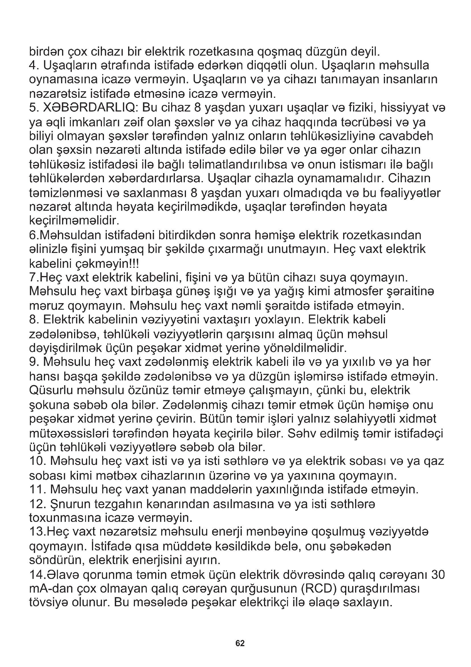 ya əqli imkanları zəif olan şəxslər və ya cihaz haqqında təcrübəsi və ya biliyi olmayan şəxslər tərəfindən yalnız onların təhlükəsizliyinə cavabdeh olan şəxsin nəzarəti altında istifadə edilə bilər və ya əgər onlar cihazın təhlükəsiz istifadəsi ilə bağlı təlimatlandırılıbsa və onun istismarı ilə bağlı təhlükələrdən xəbərdardırlarsa. Uşaqlar cihazla oynamamalıdır. Cihazın təmizlənməsi və saxlanması 8 yaşdan yuxarı olmadıqda və bu fəaliyyətlər nəzarət altında həyata keçirilmədikdə, uşaqlar tərəfindən həyata keçirilməməlidir. 6.Məhsuldan istifadəni bitirdikdən sonra həmişə elektrik rozetkasından əlinizlə fişini yumşaq bir şəkildə çıxarmağı unutmayın. Heç vaxt elektrik kabelini çəkməyin!!! 7.Heç vaxt elektrik kabelini, fişini və ya bütün cihazı suya qoymayın. Məhsulu heç vaxt birbaşa günəş işığı və ya yağış kimi atmosfer şəraitinə məruz qoymayın. Məhsulu heç vaxt nəmli şəraitdə istifadə etməyin.