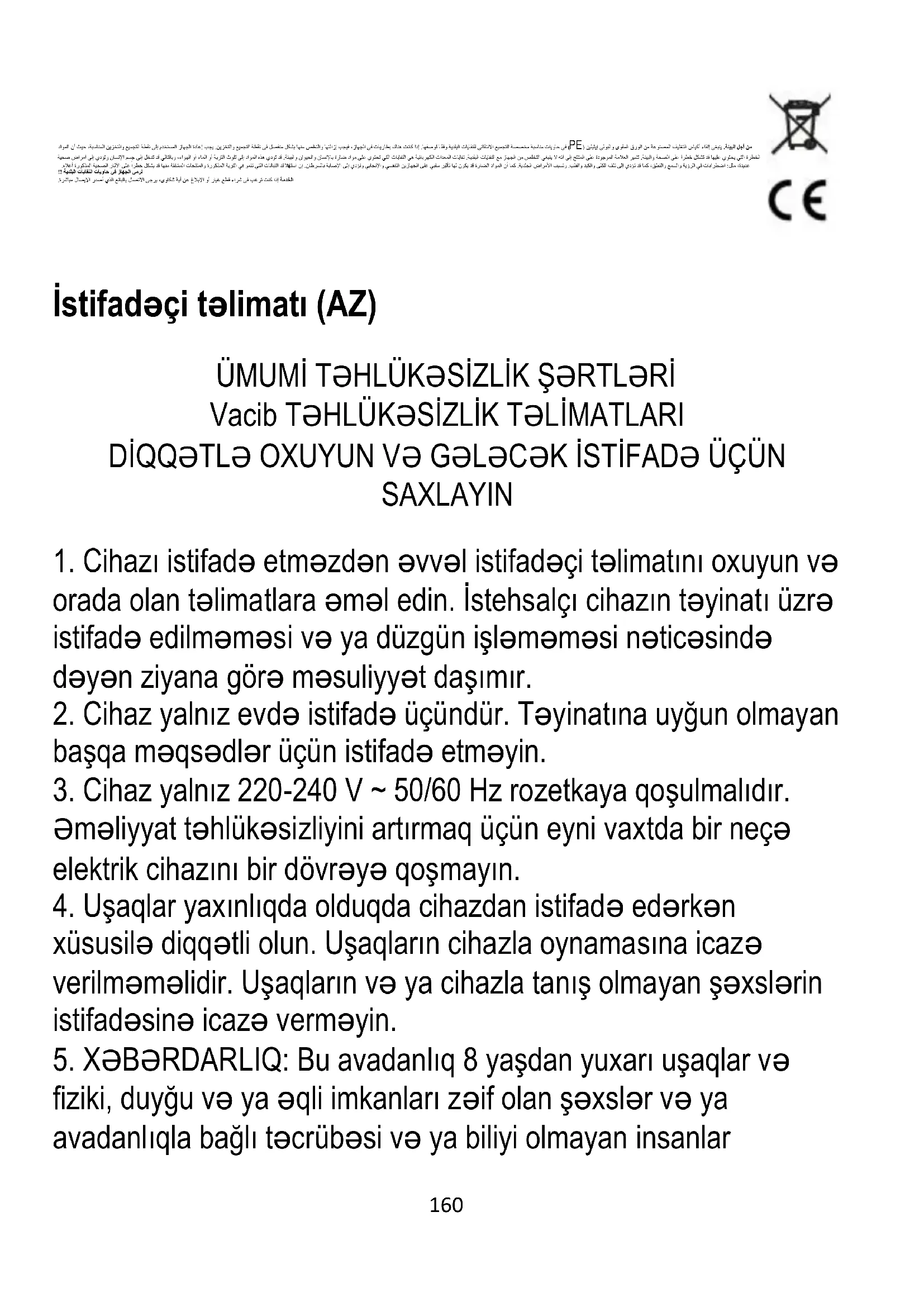 fiziki, duyğu və ya əqli imkanları zəif olan şəxslər və ya avadanlıqla bağlı təcrübəsi və ya biliyi olmayan insanlar161 tərəfindən istifadə oluna bilər. cihazın təhlükəsiz istifadəsi üzrə avadanlıq təlimatlarından istifadə edin və onun istifadəsi ilə bağlı təhlükələrdən xəbərdar olun. Uşaqlar avadanlıqla oynamamalıdırlar. 8 yaşdan yuxarı olmayan və bu fəaliyyətlər nəzarət altında həyata keçirilmədikdə, cihazın təmizlənməsi və saxlanması uşaqlar tərəfindən həyata keçirilməməlidir.