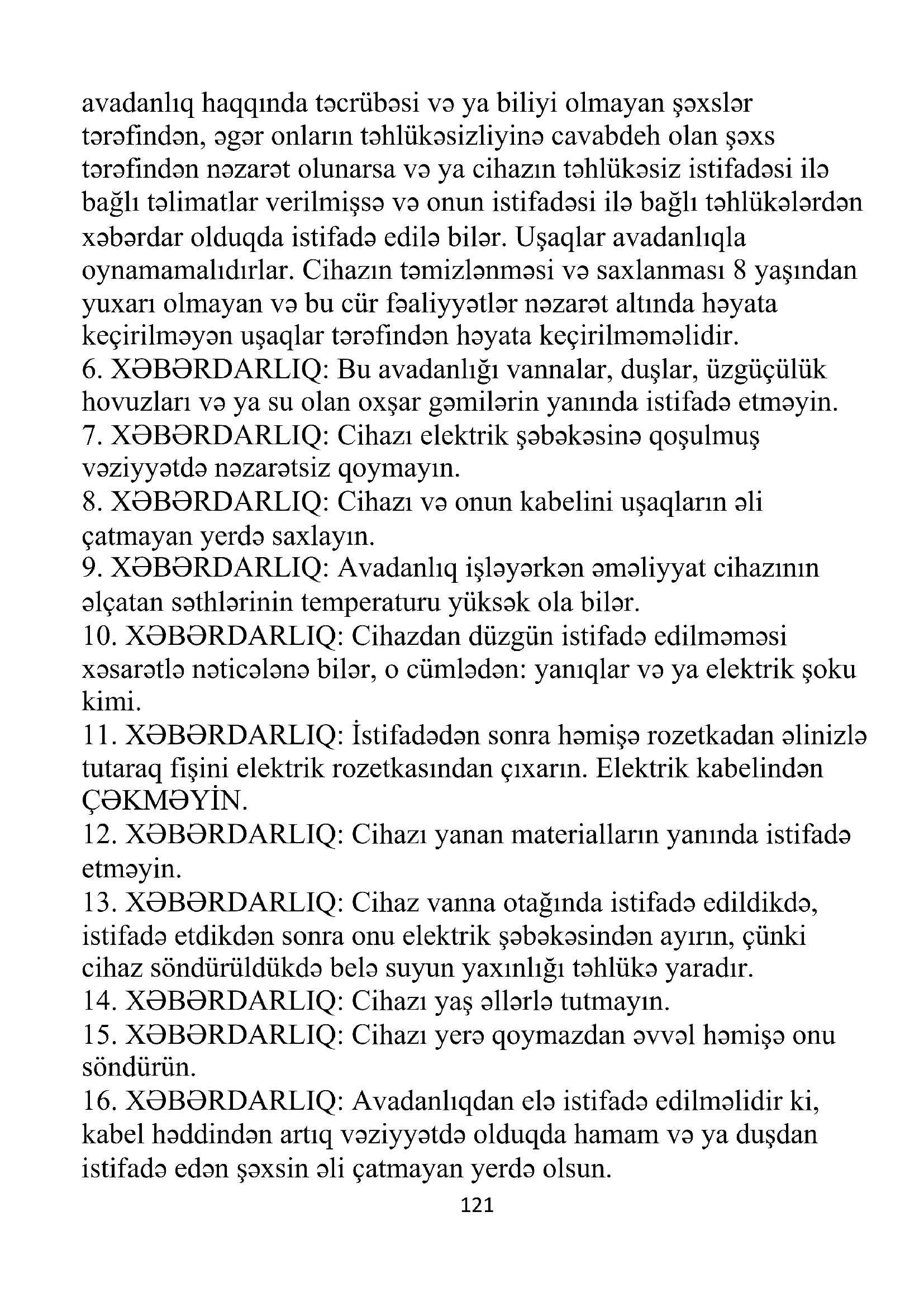 7. XƏBƏRDARLIQ: Cihazı elektrik şəbəkəsinə qoşulmuş