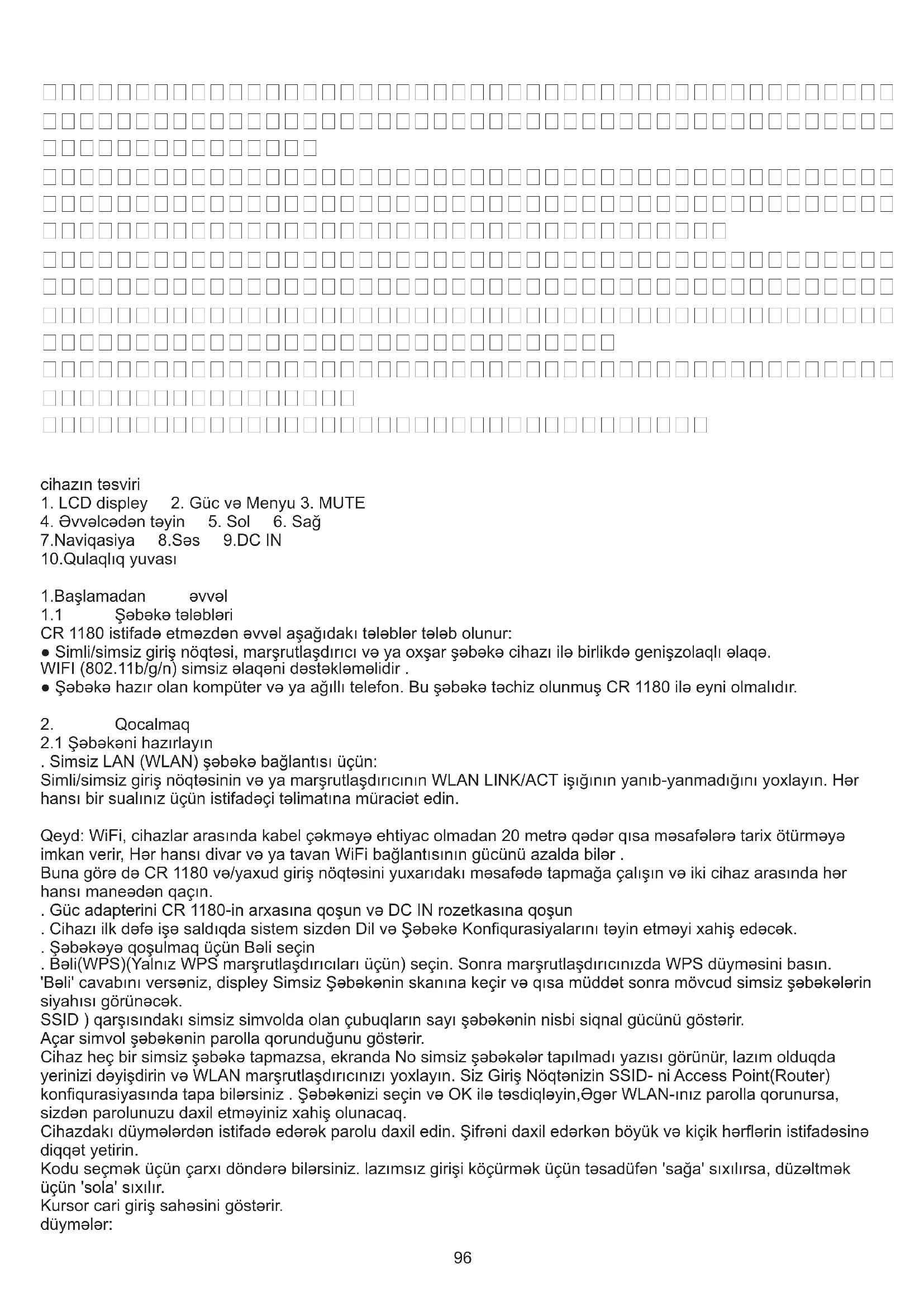 . Simsiz LAN (WLAN) şəbəkə bağlantısı üçün: Simli/simsiz giriş nöqtəsinin və ya marşrutlaşdırıcının WLAN LINK/ACT işığının yanıb-yanmadığını yoxlayın. Hər hansı bir sualınız üçün istifadəçi təlimatına müraciət edin. Qeyd: WiFi, cihazlar arasında kabel çəkməyə ehtiyac olmadan 20 metrə qədər qısa məsafələrə tarix ötürməyə imkan verir, Hər hansı divar və ya tavan WiFi bağlantısının gücünü azalda bilər . Buna görə də CR 1180 və/yaxud giriş nöqtəsini yuxarıdakı məsafədə tapmağa çalışın və iki cihaz arasında hər hansı maneədən qaçın. . Güc adapterini CR 1180-in arxasına qoşun və DC IN rozetkasına qoşun . Cihazı ilk dəfə işə saldıqda sistem sizdən Dil və Şəbəkə Konfiqurasiyalarını təyin etməyi xahiş edəcək. . Şəbəkəyə qoşulmaq üçün Bəli seçin . Bəli(WPS)(Yalnız WPS marşrutlaşdırıcıları üçün) seçin. Sonra marşrutlaşdırıcınızda WPS düyməsini basın. 'Bəli' cavabını versəniz, displey Simsiz Şəbəkənin skanına keçir və qısa müddət sonra mövcud simsiz şəbəkələrin siyahısı görünəcək. SSID ) qarşısındakı simsiz simvolda olan çubuqların sayı şəbəkənin nisbi siqnal gücünü göstərir. Açar simvol şəbəkənin parolla qorunduğunu göstərir. Cihaz heç bir simsiz şəbəkə tapmazsa, ekranda No simsiz şəbəkələr tapılmadı yazısı görünür, lazım olduqda yerinizi dəyişdirin və WLAN marşrutlaşdırıcınızı yoxlayın. Siz Giriş Nöqtənizin SSID- ni Access Point(Router) konfiqurasiyasında tapa bilərsiniz . Şəbəkənizi seçin və OK ilə təsdiqləyin,Əgər WLAN-ınız parolla qorunursa, sizdən parolunuzu daxil etməyiniz xahiş olunacaq. Cihazdakı düymələrdən istifadə edərək parolu daxil edin. Şifrəni daxil edərkən böyük və kiçik hərflərin istifadəsinə diqqət yetirin. Kodu seçmək üçün çarxı döndərə bilərsiniz. lazımsız girişi köçürmək üçün təsadüfən 'sağa' sıxılırsa, düzəltmək üçün 'sola' sıxılır. Kursor cari giriş sahəsini göstərir. düymələr:97 'Sol' Əvvəlki giriş sahəsinə keçin, girişin üzərinə yazıla bilər 'Sağ' Növbəti giriş sahəsinə keçin, son giriş yadda saxlanılır 'YUXARI / AŞAĞI' Rəqəm/hərf seçin 'Daxil et' Bütün girişi təsdiqləyin Şəbəkəyə qoşulma bir neçə saniyə çəkə bilər. Bağlantı qurulduqdan sonra əsas menyu ilə əsas menyu görünür menyu maddələri: - İnternet Radiosu: Dünyadakı radio stansiyalarına giriş - Media Mərkəzi: Axın qabiliyyəti olan proqram təminatı vasitəsilə UPnP cihazlarınıza daxil olun. - Konfiqurasiya: Müxtəlif sistem parametrləri - Yerli Radio: Müəyyən bir bölgədəki radio stansiyalarına giriş (məsələn, yalnız Alman stansiyaları) - My media U : Onlayn media kitabxanasına giriş. Bu menyu elementi yalnız funksiya Konfiqurasiya altında aktivləşdirilibsə görünür 〉Mediamı idarə et U. . Gözləmə rejiminə daxil olmaq üçün Güc I Menyu düyməsini basıb saxlayın. Saat, tarix və istənilən aktiv Zəngli saatlar ekranda göstərilir. . Şəbəkə bağlantısı qurmusunuzsa və şəbəkə daxilində yenidən CR 1180 istifadə edirsinizsə, CR 1180 avtomatik olaraq əlaqə yaradacaq. Şəbəkəni dəyişdirmək istəsəniz, müvafiq əlaqəni qurmaq üçün konfiqurasiyanı daxil edin. . Nömrələri/hərfləri daxil etmək üçün YUKARI/AŞAĞI rulonu fırladın. İstədiyiniz hərfdə olduqdan sonra növbəti girişə keçmək üçün Sağa basın. Daxiletmənin sonunda olduğunuzda, təsdiqləmək üçün Enter düyməsini basın. Əvvəlki girişə keçmək üçün Sola basa bilərsiniz. Səs səviyyəsini tənzimləmək üçün səs çarxını çevirin.