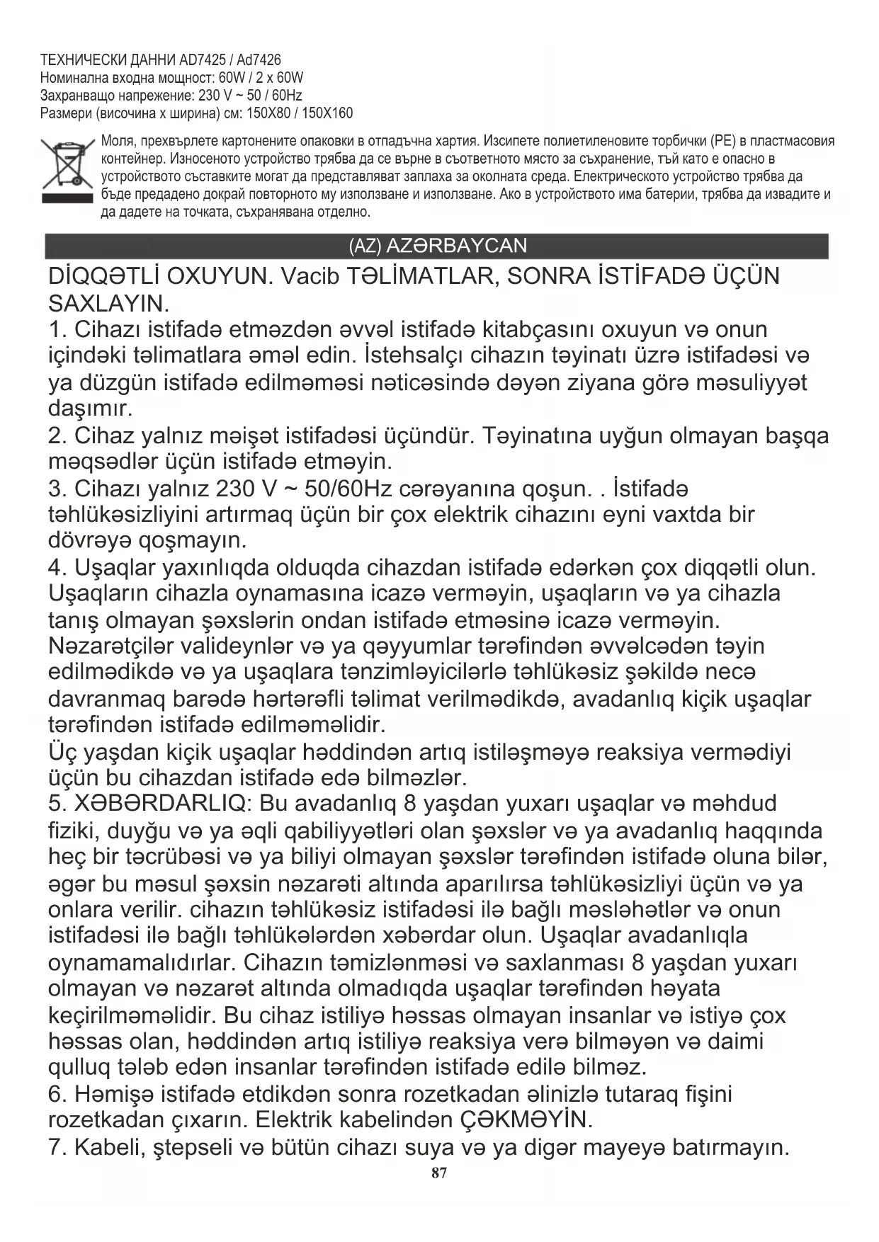 - Məhsulu ütüləməyin! TEXNİKİ MƏLUMAT AD7425 / Ad7426 Nominasiya edilmiş güc girişi: 60W / 2 x 60W Təchizat gərginliyi: 230 V ~ 50/60Hz Ölçülər (yüksək x en) sm: 150X80 / 150X160 Zhmt olmasa karton qablaşdırmanı tullantı kağıza köçürün. Polietilen torbaları (PE) plastik qaba tökün Aşınmış cihaz müvafiq anbara qaytarılmalıdır, çünki o, cihazda thlüklidir maddlr traf mühit üçün thlük yarada bilr. Elektrik cihazı limit qdr thvil verilmlidir onun tkrar istifadsi v istifadsi. gr cihazda batareyalar varsa, onu çıxarıb ayrıca saxlanan nöqty vermk lazımdır.