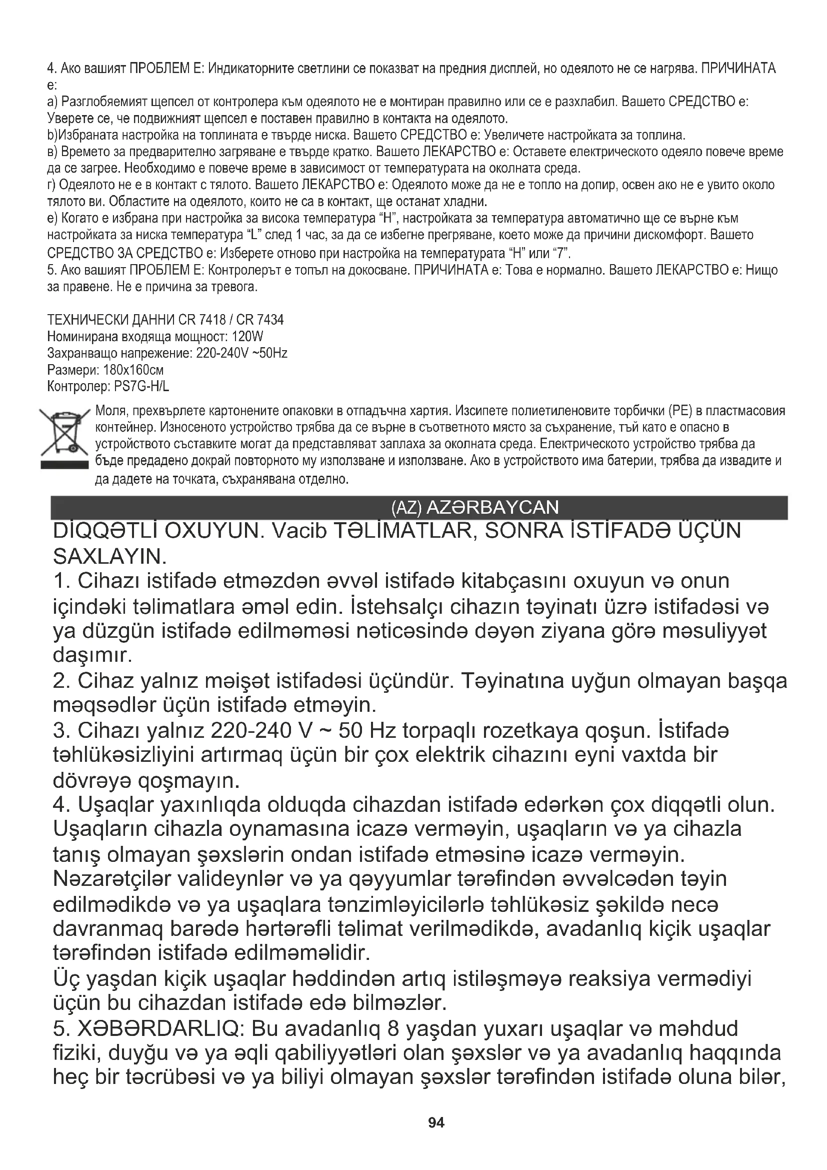 edilmişdir, avadanlığın təyinatına uyğun istifadə edildikdə işləməməlidir. Sigorta işə salınarsa, cihaz işləməyi dayandıracaq, avadanlıq təmir üçün istehsalçıya və ya onun nümayəndəsinə qaytarılmalıdır. Məhsul: Elektrik atma blankı CR7418 / CR7434 Bu elektrik yorğan üst yorğan kimi istifadə edilmək üçün nəzərdə tutulmuşdur, o, fərdin üstündə deyil, altında olmalıdır və ya döşəkdə deyil, şəxsin üstündəki üst təbəqənin üstündə yerləşdirilməlidir. Onu insanın ətrafına və ya altına qoymayın. İstifadəçinin hərəkətini qadağan etməmək üçün boş qalmalıdır. Kontrolleri örtməyin və nəzarətçiyə təzyiq göstərməyin. İLK İSTİFADƏDƏN ƏVVƏL