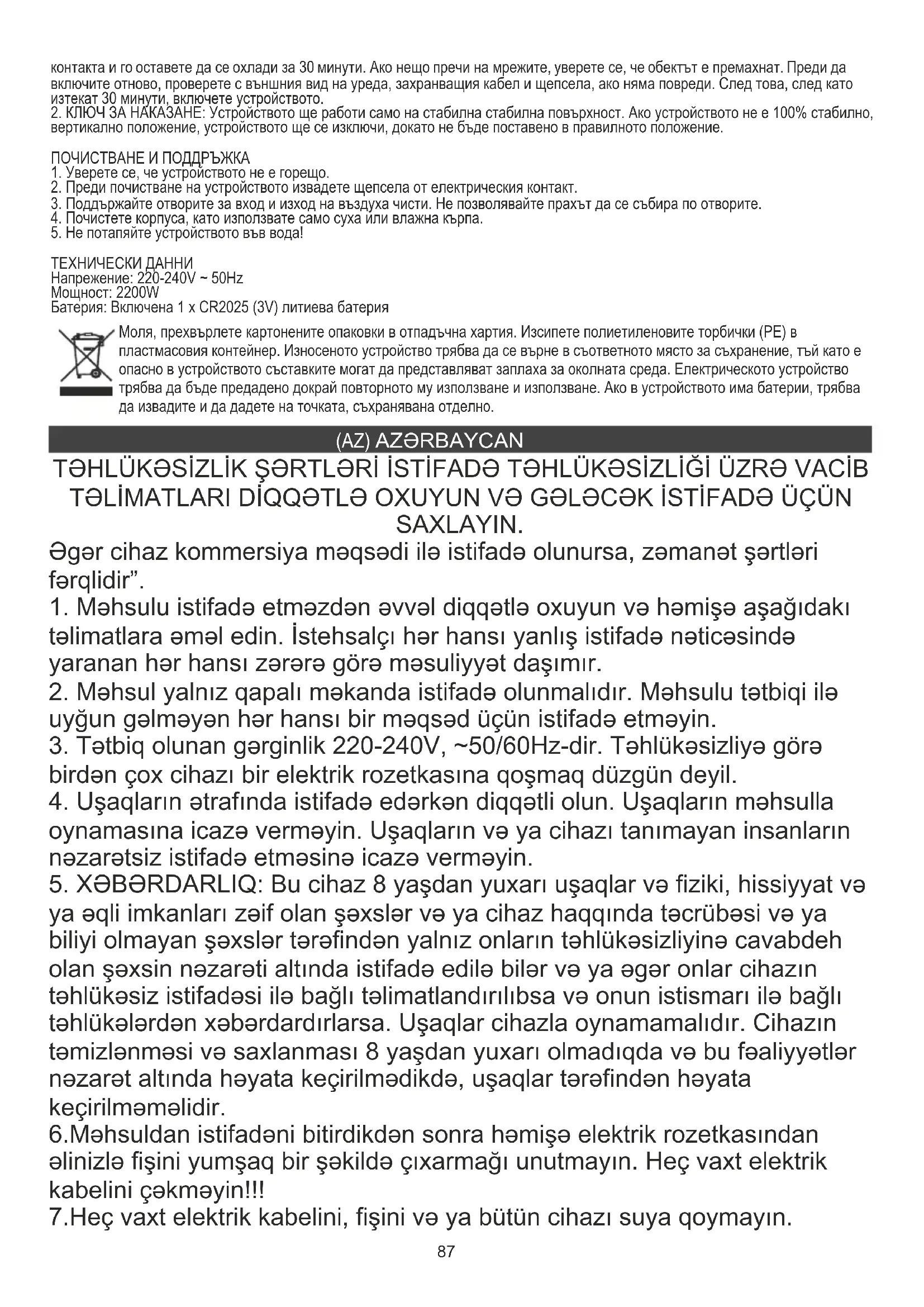 ya əqli imkanları zəif olan şəxslər və ya cihaz haqqında təcrübəsi və ya biliyi olmayan şəxslər tərəfindən yalnız onların təhlükəsizliyinə cavabdeh olan şəxsin nəzarəti altında istifadə edilə bilər və ya əgər onlar cihazın təhlükəsiz istifadəsi ilə bağlı təlimatlandırılıbsa və onun istismarı ilə bağlı təhlükələrdən xəbərdardırlarsa. Uşaqlar cihazla oynamamalıdır. Cihazın təmizlənməsi və saxlanması 8 yaşdan yuxarı olmadıqda və bu fəaliyyətlər nəzarət altında həyata keçirilmədikdə, uşaqlar tərəfindən həyata keçirilməməlidir. 6.Məhsuldan istifadəni bitirdikdən sonra həmişə elektrik rozetkasından əlinizlə fişini yumşaq bir şəkildə çıxarmağı unutmayın. Heç vaxt elektrik kabelini çəkməyin!!! 7.Heç vaxt elektrik kabelini, fişini və ya bütün cihazı suya qoymayın.88 Məhsulu heç vaxt birbaşa günəş işığı və ya yağış kimi atmosfer şəraitinə məruz qoymayın. Məhsulu heç vaxt nəmli şəraitdə istifadə etməyin.