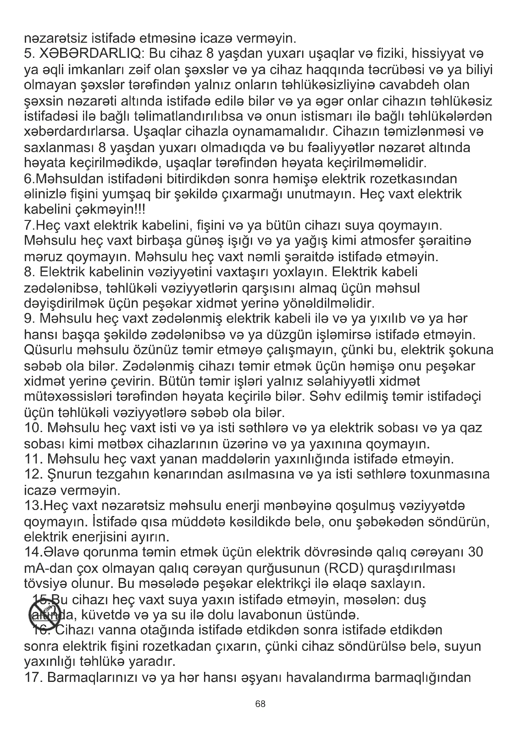 icazə verməyin. 13.Heç vaxt nəzarətsiz məhsulu enerji mənbəyinə qoşulmuş vəziyyətdə qoymayın. İstifadə qısa müddətə kəsildikdə belə, onu şəbəkədən söndürün, elektrik enerjisini ayırın. 14.Əlavə qorunma təmin etmək üçün elektrik dövrəsində qalıq cərəyanı 30 mA-dan çox olmayan qalıq cərəyan qurğusunun (RCD) quraşdırılması tövsiyə olunur. Bu məsələdə peşəkar elektrikçi ilə əlaqə saxlayın. 15.Bu cihazı heç vaxt suya yaxın istifadə etməyin, məsələn: duş altında, küvetdə və ya su ilə dolu lavabonun üstündə.