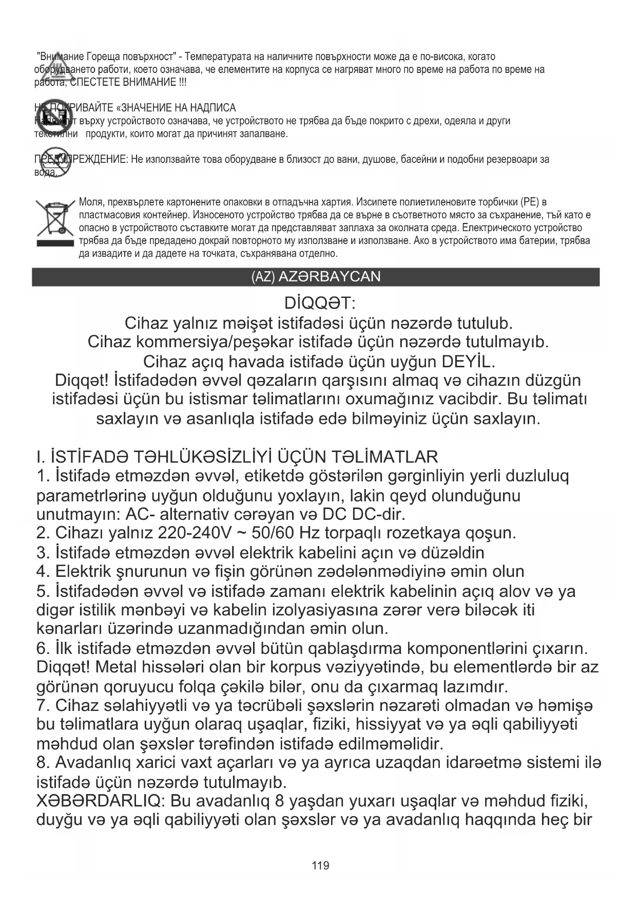 DİQQƏT: Cihaz yalnız məişət istifadəsi üçün nəzərdə tutulub. Cihaz kommersiya/peşəkar istifadə üçün nəzərdə tutulmayıb. Cihaz açıq havada istifadə üçün uyğun DEYİL. Diqqət! İstifadədən əvvəl qəzaların qarşısını almaq və cihazın düzgün istifadəsi üçün bu istismar təlimatlarını oxumağınız vacibdir. Bu təlimatı saxlayın və asanlıqla istifadə edə bilməyiniz üçün saxlayın.