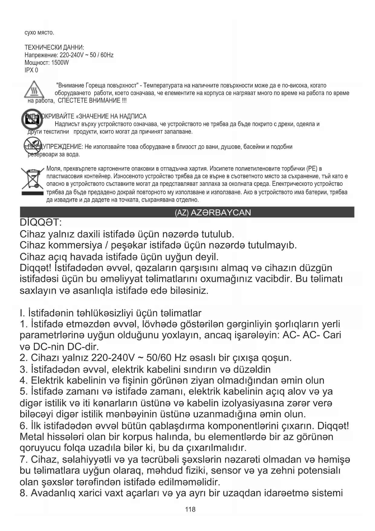 DİQQƏT: Cihaz yalnız daxili istifadə üçün nəzərdə tutulub. Cihaz kommersiya / peşəkar istifadə üçün nəzərdə tutulmayıb. Cihaz açıq havada istifadə üçün uyğun deyil. Diqqət! İstifadədən əvvəl, qəzaların qarşısını almaq və cihazın düzgün istifadəsi üçün bu əməliyyat təlimatlarını oxumağınız vacibdir. Bu təlimatı saxlayın və asanlıqla istifadə edə biləsiniz.