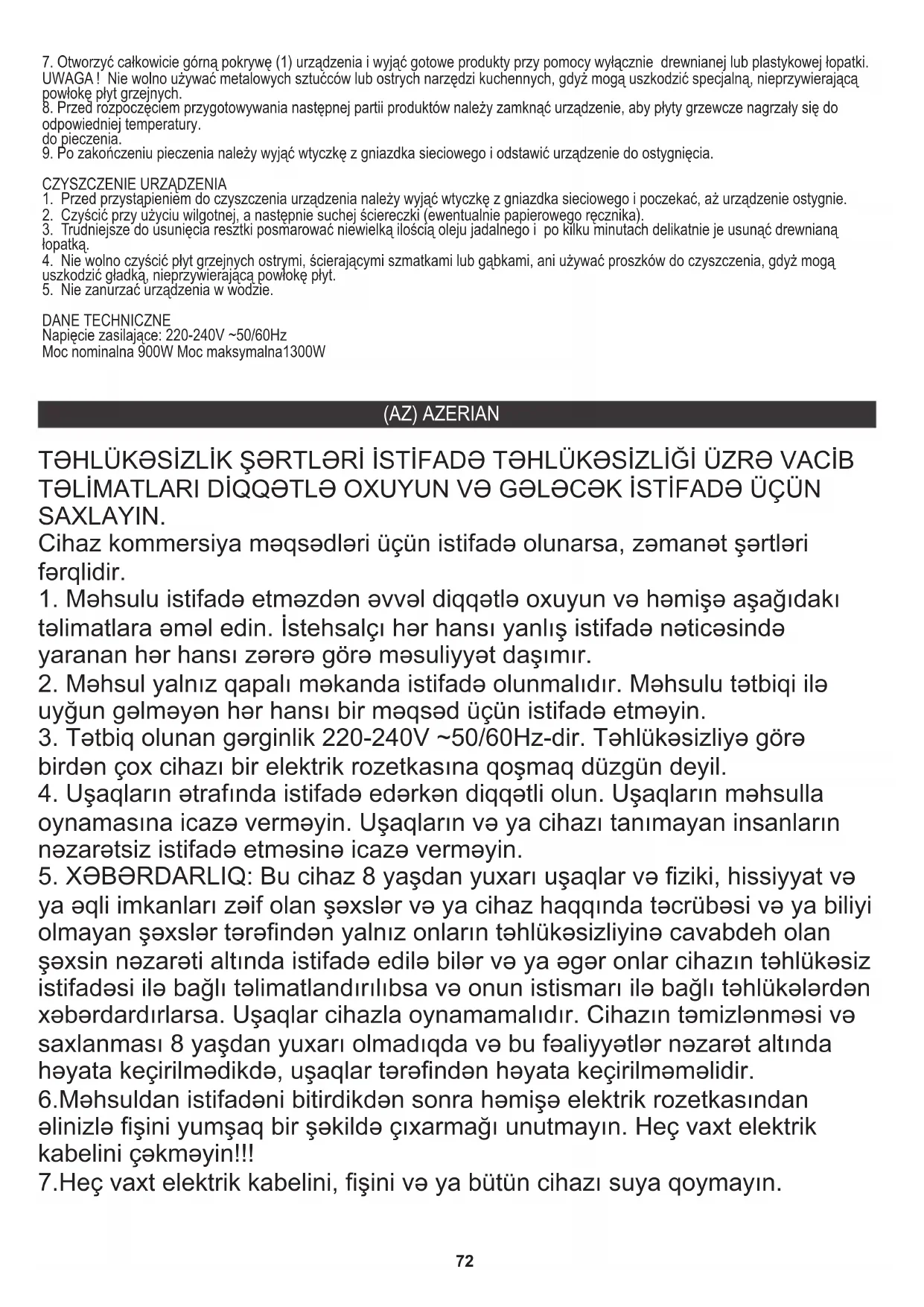 ya əqli imkanları zəif olan şəxslər və ya cihaz haqqında təcrübəsi və ya biliyi olmayan şəxslər tərəfindən yalnız onların təhlükəsizliyinə cavabdeh olan şəxsin nəzarəti altında istifadə edilə bilər və ya əgər onlar cihazın təhlükəsiz istifadəsi ilə bağlı təlimatlandırılıbsa və onun istismarı ilə bağlı təhlükələrdən xəbərdardırlarsa. Uşaqlar cihazla oynamamalıdır. Cihazın təmizlənməsi və saxlanması 8 yaşdan yuxarı olmadıqda və bu fəaliyyətlər nəzarət altında həyata keçirilmədikdə, uşaqlar tərəfindən həyata keçirilməməlidir.