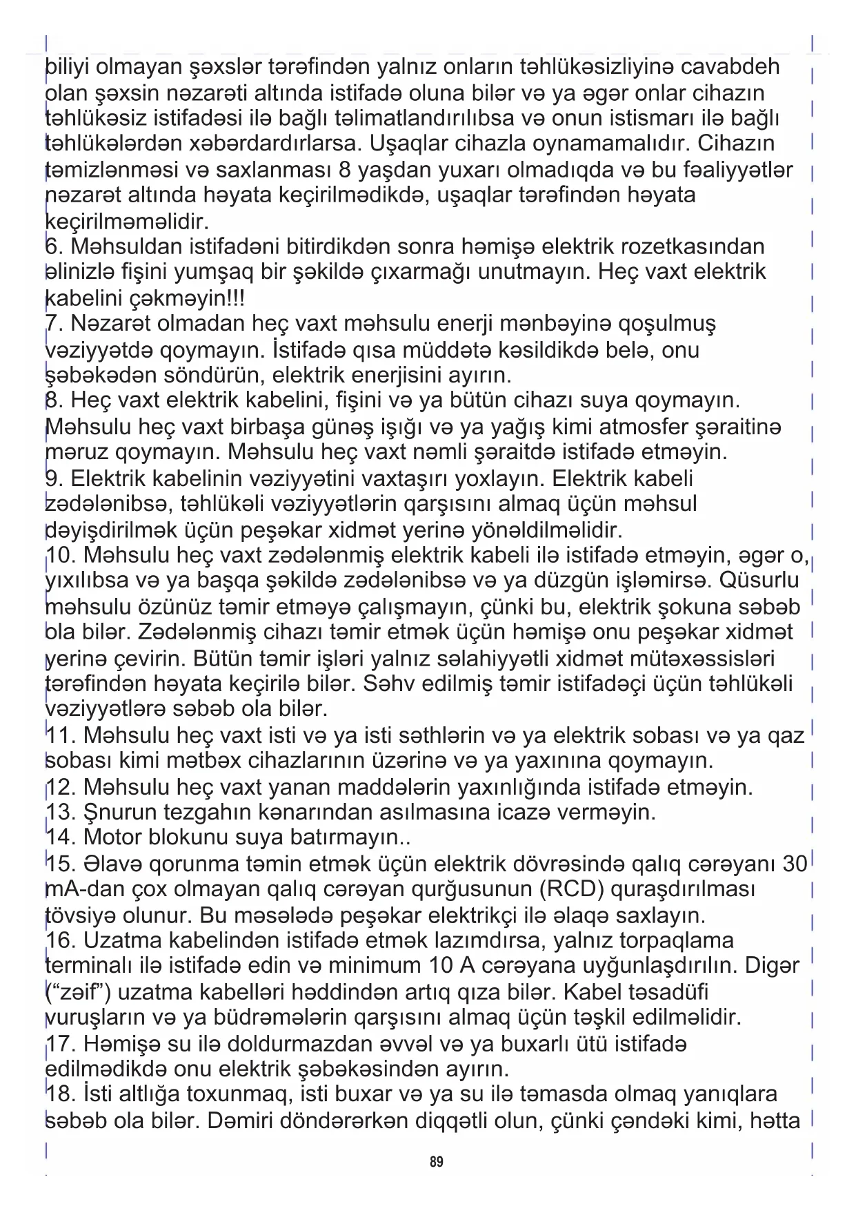 edilmədikdə onu elektrik şəbəkəsindən ayırın. biliyi olmayan şəxslər tərəfindən yalnız onların təhlükəsizliyinə cavabdeh olan şəxsin nəzarəti altında istifadə oluna bilər və ya əgər onlar cihazın təhlükəsiz istifadəsi ilə bağlı təlimatlandırılıbsa və onun istismarı ilə bağlı təhlükələrdən xəbərdardırlarsa. Uşaqlar cihazla oynamamalıdır. Cihazın təmizlənməsi və saxlanması 8 yaşdan yuxarı olmadıqda və bu fəaliyyətlər nəzarət altında həyata keçirilmədikdə, uşaqlar tərəfindən həyata keçirilməməlidir.