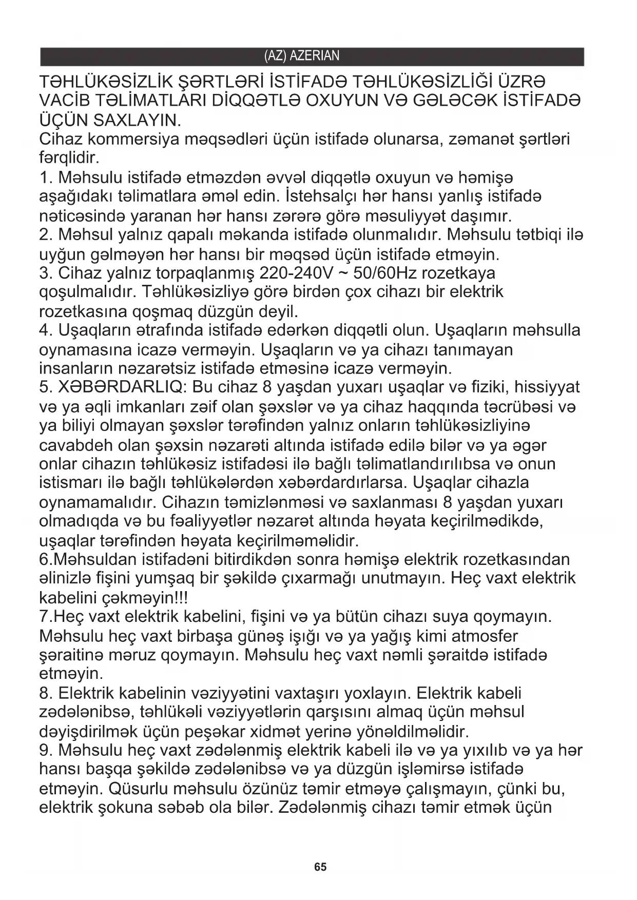 zədələnibsə, təhlükəli vəziyyətlərin qarşısını almaq üçün məhsul dəyişdirilmək üçün peşəkar xidmət yerinə yönəldilməlidir. TƏHLÜKƏSİZLİK ŞƏRTLƏRİ İSTİFADƏ TƏHLÜKƏSİZLİĞİ ÜZRƏ VACİB TƏLİMATLARI DİQQƏTLƏ OXUYUN VƏ GƏLƏCƏK İSTİFADƏ ÜÇÜN SAXLAYIN. 6.Məhsuldan istifadəni bitirdikdən sonra həmişə elektrik rozetkasından əlinizlə fişini yumşaq bir şəkildə çıxarmağı unutmayın. Heç vaxt elektrik kabelini çəkməyin!!! 7.Heç vaxt elektrik kabelini, fişini və ya bütün cihazı suya qoymayın. Məhsulu heç vaxt birbaşa günəş işığı və ya yağış kimi atmosfer şəraitinə məruz qoymayın. Məhsulu heç vaxt nəmli şəraitdə istifadə etməyin.