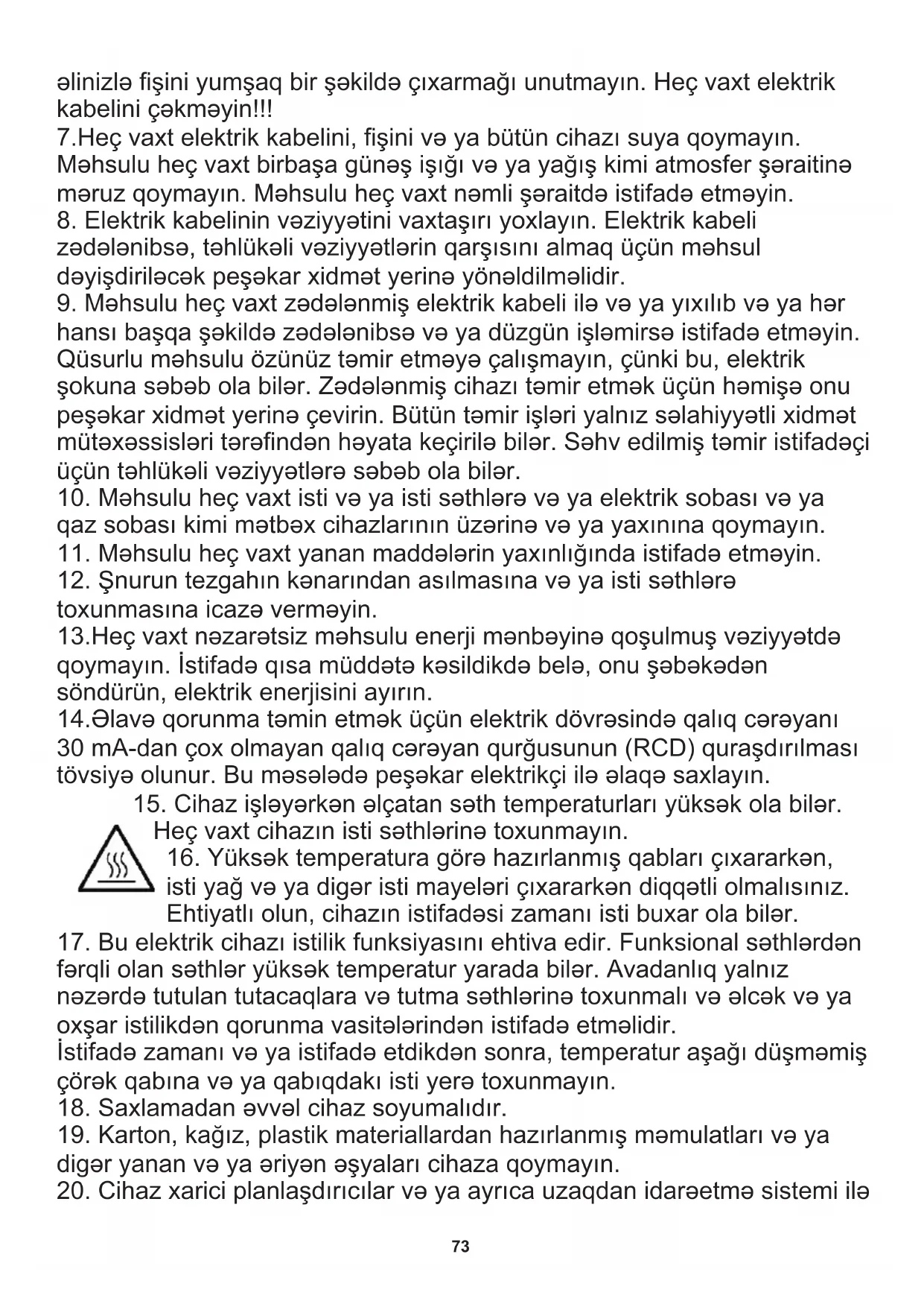 17. Bu elektrik cihazı istilik funksiyasını ehtiva edir. Funksional səthlərdən