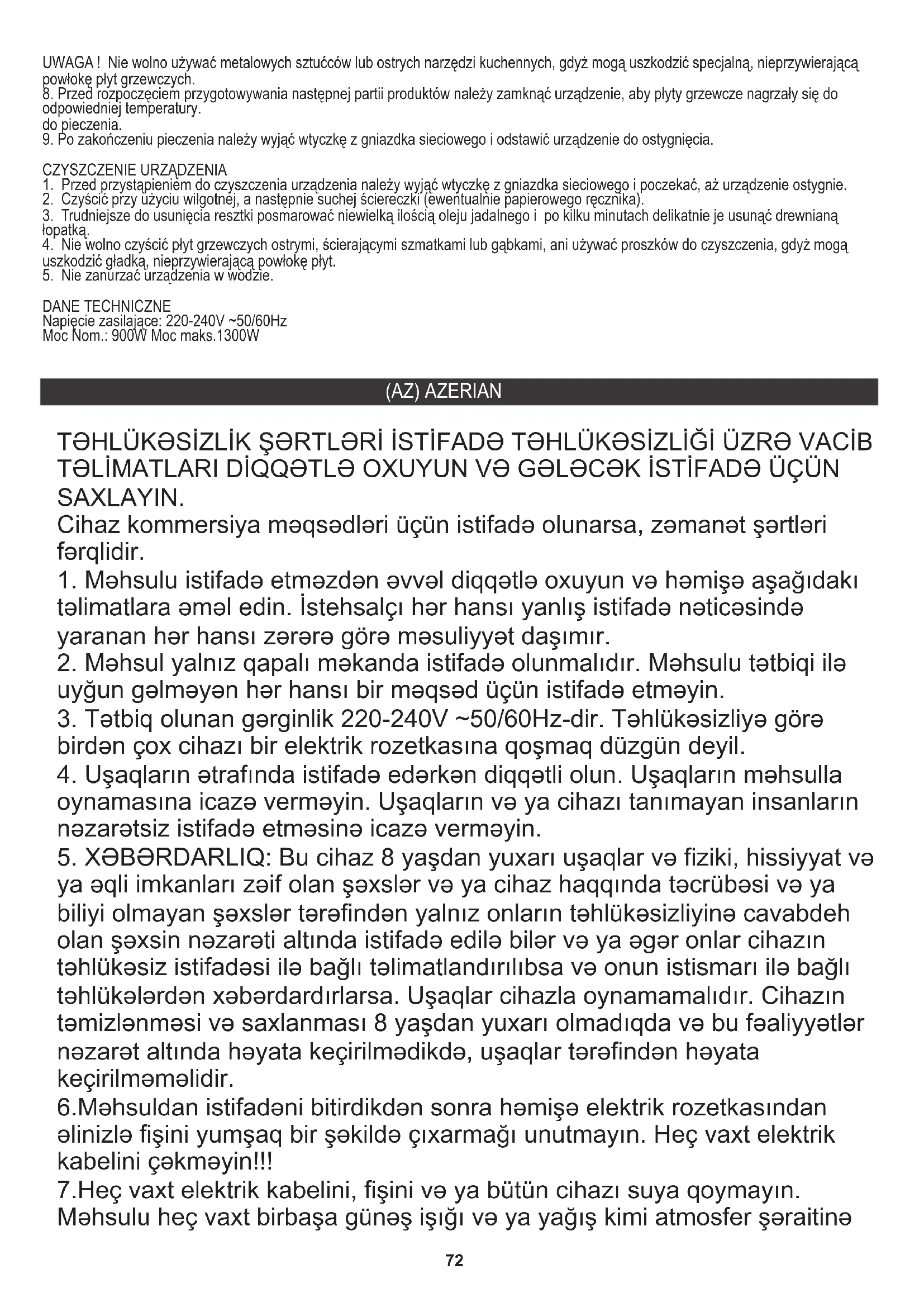 ya əqli imkanları zəif olan şəxslər və ya cihaz haqqında təcrübəsi və ya biliyi olmayan şəxslər tərəfindən yalnız onların təhlükəsizliyinə cavabdeh olan şəxsin nəzarəti altında istifadə edilə bilər və ya əgər onlar cihazın təhlükəsiz istifadəsi ilə bağlı təlimatlandırılıbsa və onun istismarı ilə bağlı təhlükələrdən xəbərdardırlarsa. Uşaqlar cihazla oynamamalıdır. Cihazın təmizlənməsi və saxlanması 8 yaşdan yuxarı olmadıqda və bu fəaliyyətlər nəzarət altında həyata keçirilmədikdə, uşaqlar tərəfindən həyata keçirilməməlidir. 6.Məhsuldan istifadəni bitirdikdən sonra həmişə elektrik rozetkasından əlinizlə fişini yumşaq bir şəkildə çıxarmağı unutmayın. Heç vaxt elektrik kabelini çəkməyin!!! 7.Heç vaxt elektrik kabelini, fişini və ya bütün cihazı suya qoymayın. Məhsulu heç vaxt birbaşa günəş işığı və ya yağış kimi atmosfer şəraitinə TƏHLÜKƏSİZLİK ŞƏRTLƏRİ İSTİFADƏ TƏHLÜKƏSİZLİĞİ ÜZRƏ VACİB TƏLİMATLARI DİQQƏTLƏ OXUYUN VƏ GƏLƏCƏK İSTİFADƏ ÜÇÜN SAXLAYIN. (AZ) AZERIAN73