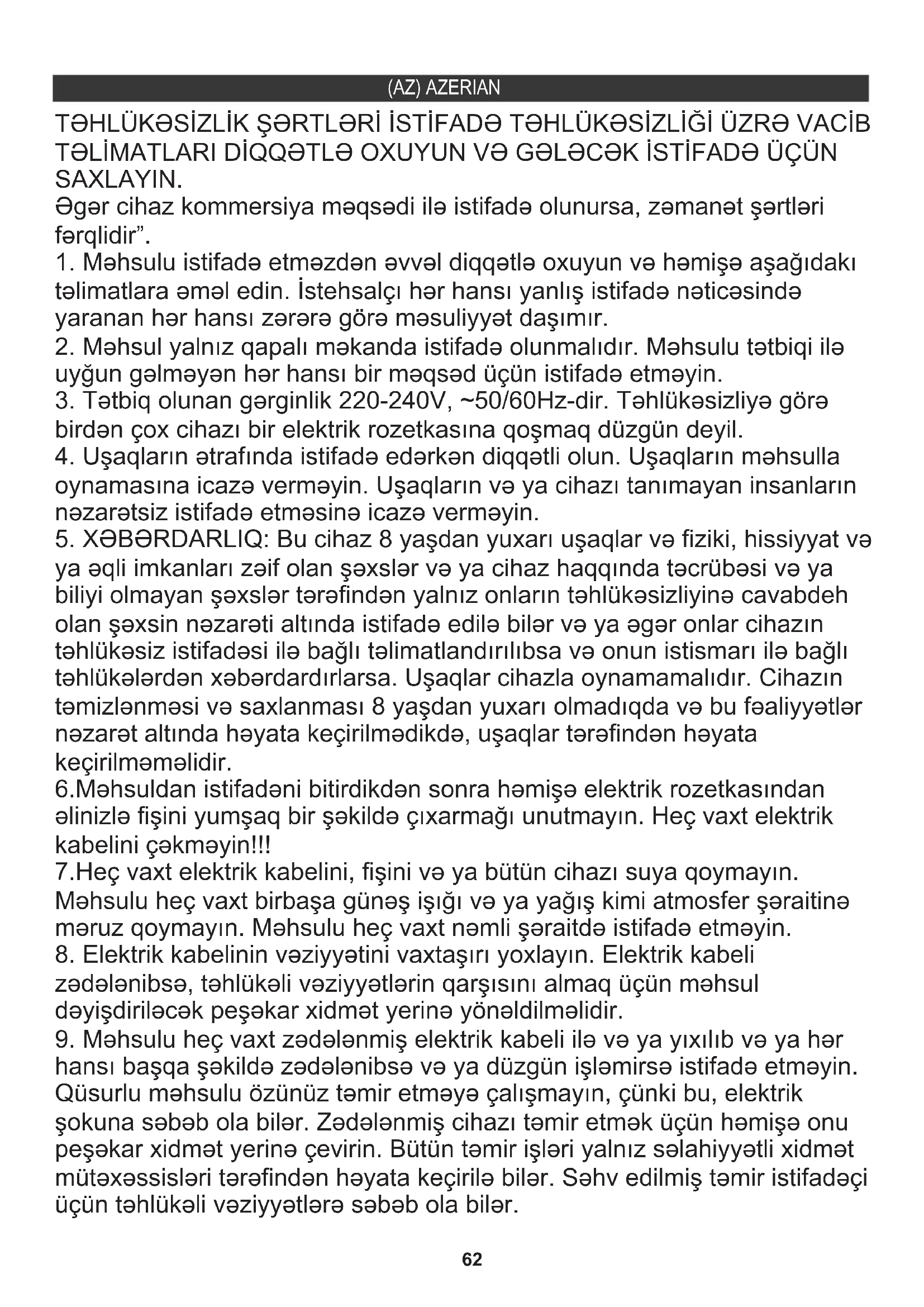təlimatlara əməl edin. İstehsalçı hər hansı yanlış istifadə nəticəsində yaranan hər hansı zərərə görə məsuliyyət daşımır. 6.Məhsuldan istifadəni bitirdikdən sonra həmişə elektrik rozetkasından əlinizlə fişini yumşaq bir şəkildə çıxarmağı unutmayın. Heç vaxt elektrik kabelini çəkməyin!!!