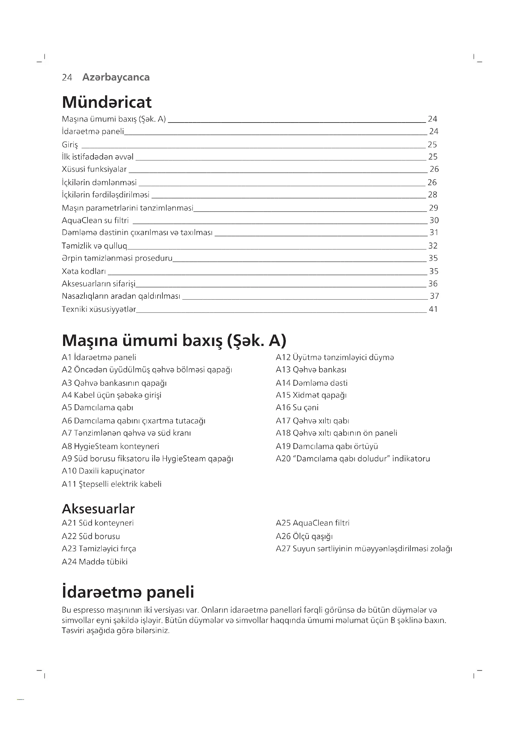 Azərbaycanca Mündəricat Maşına ümumi baxış (Şək. A) _______________________________________________________________ 24 İdarəetmə paneli__________________________________________________________________________ 24 Giriş ____________________________________________________________________________________ 25 İlk istifadədən əvvəl _______________________________________________________________________ 25 Xüsusi funksiyalar _________________________________________________________________________ 26 İçkilərin dəmlənməsi ______________________________________________________________________ 26 İçkilərin fərdiləşdirilməsi ___________________________________________________________________ 28 Maşın parametrlərini tənzimlənməsi_________________________________________________________ 29 AquaClean su filtri ________________________________________________________________________ 30 Dəmləmə dəstinin çıxarılması və taxılması ____________________________________________________ 31 Təmizlik və qulluq_________________________________________________________________________ 32 Ərpin təmizlənməsi proseduru______________________________________________________________ 35 Xəta kodları ______________________________________________________________________________ 35 Aksesuarların sifarişi_______________________________________________________________________ 36 Nasazlıqların aradan qaldırılması ____________________________________________________________ 37 Texniki xüsusiyyətlər_______________________________________________________________________ 41 Maşına ümumi baxış (Şək. A) A1 İdarəetmə paneli A2 Öncədən üyüdülmüş qəhvə bölməsi qapağı A3 Qəhvə bankasının qapağı A4 Kabel üçün şəbəkə girişi A5 Damcılama qabı A6 Damcılama qabını çıxartma tutacağı A7 Tənzimlənən qəhvə və süd kranı A8 HygieSteam konteyneri A9 Süd borusu fiksatoru ilə HygieSteam qapağı A10 Daxili kapuçinator A11 Ştepselli elektrik kabeli A12 Üyütmə tənzimləyici düymə A13 Qəhvə bankası A14 Dəmləmə dəsti A15 Xidmət qapağı A16 Su çəni A17 Qəhvə xıltı qabı A18 Qəhvə xıltı qabının ön paneli A19 Damcılama qabı örtüyü A20 “Damcılama qabı doludur” indikatoru Aksesuarlar A21 Süd konteyneri A22 Süd borusu A23 Təmizləyici fırça A24 Maddə tübiki A25 AquaClean filtri A26 Ölçü qaşığı A27 Suyun sərtliyinin müəyyənləşdirilməsi zolağı İdarəetmə paneli Bu espresso maşınının iki versiyası var. Onların idarəetmə panelləri fərqli görünsə də bütün düymələr və simvollar eyni şəkildə işləyir. Bütün düymələr və simvollar haqqında ümumi məlumat üçün B şəklinə baxın. Təsviri aşağıda görə bilərsiniz.25 Azərbaycanca Ekranda hərəkət etmək üçün yuxarı və aşağı oxlardan, seçimlərinizi etmək və ya təsdiqləmək üçün isə OK simvolundan istifadə edin. B1 Yandır/söndür düyməsi B2 Bir toxunuşla içki simvolları B3 CoffeeMaestro simvolu B4 Daha çox içki menyusu B5 Başlama/dayandırma düyməsi B6 Naviqasiya simvolları (yuxarı, aşağı, geri, ok) B7 Ekran B8 Maşın parametrləri B9 Təmizləmə menyusu B10 Şəxsi profillər Giriş Saeco tam avtomatik qəhvə maşınını satın aldığınız üçün sizi təbrik edirik! Saeco-nun təklif etdiyi onlayn dəstəkdən tam faydalanmaq üçün www.saeco.com/MyCoffeeMachine ünvanına keçin və məhsulunuzu qeydiyyatdan keçirin. Qeyd: Bu maşın qəhvə ilə sınaqdan keçirilmişdir. Cihaz diqqətlə təmizlənsə belə, bəzi qəhvə qalıqları qala bilər. Bununla belə, maşının tamamilə yeni olduğuna dair zəmanət veririk. İlk istifadədən əvvəl