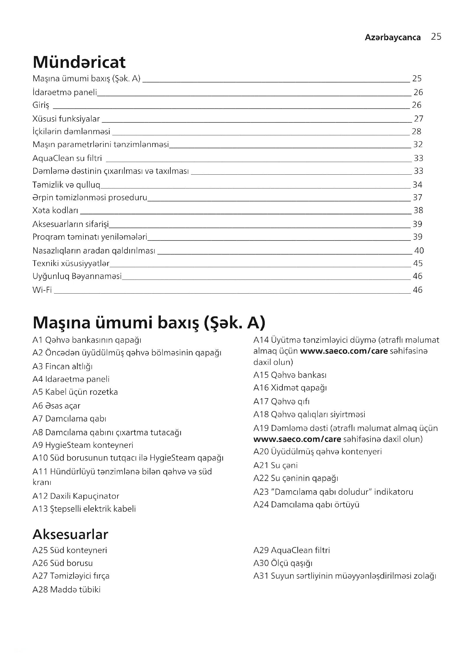 Azərbaycanca Mündəricat Maşına ümumi baxış (Şək. A) _______________________________________________________________ 25 İdarəetmə paneli__________________________________________________________________________ 26 Giriş ____________________________________________________________________________________ 26 Xüsusi funksiyalar _________________________________________________________________________ 27 İçkilərin dəmlənməsi ______________________________________________________________________ 28 Maşın parametrlərini tənzimlənməsi_________________________________________________________ 32 AquaClean su filtri ________________________________________________________________________ 33 Dəmləmə dəstinin çıxarılması və taxılması ____________________________________________________ 33 Təmizlik və qulluq_________________________________________________________________________ 34 Ərpin təmizlənməsi proseduru______________________________________________________________ 37 Xəta kodları ______________________________________________________________________________ 38 Aksesuarların sifarişi_______________________________________________________________________ 39 Proqram təminatı yeniləmələri______________________________________________________________ 39 Nasazlıqların aradan qaldırılması ____________________________________________________________ 40 Texniki xüsusiyyətlər_______________________________________________________________________ 45 Uyğunluq Bəyannaməsi____________________________________________________________________ 46 Wi-Fi ____________________________________________________________________________________ 46 Maşına ümumi baxış (Şək. A) A1 Qəhvə bankasının qapağı A2 Öncədən üyüdülmüş qəhvə bölməsinin qapağı A3 Fincan altlığı A4 Idarəetmə paneli A5 Kabel üçün rozetka A6 Əsas açar A7 Damcılama qabı A8 Damcılama qabını çıxartma tutacağı A9 HygieSteam konteyneri A10 Süd borusunun tutqacı ilə HygieSteam qapağı A11 Hündürlüyü tənzimlənə bilən qəhvə və süd kranı A12 Daxili Kapuçinator A13 Ştepselli elektrik kabeli A14 Üyütmə tənzimləyici düymə (ətraflı məlumat almaq üçün www.saeco.com/care səhifəsinə daxil olun) A15 Qəhvə bankası A16 Xidmət qapağı A17 Qəhvə qıfı A18 Qəhvə qalıqları siyirtməsi A19 Dəmləmə dəsti (ətraflı məlumat almaq üçün www.saeco.com/care səhifəsinə daxil olun) A20 Üyüdülmüş qəhvə kontenyeri A21 Su çəni A22 Su çəninin qapağı A23 “Damcılama qabı doludur” indikatoru A24 Damcılama qabı örtüyü Aksesuarlar A25 Süd konteyneri A26 Süd borusu A27 Təmizləyici fırça A28 Maddə tübiki A29 AquaClean filtri A30 Ölçü qaşığı A31 Suyun sərtliyinin müəyyənləşdirilməsi zolağı26 Azərbaycanca İdarəetmə paneli Bu espresso maşınının iki versiyası var. Onların idarəetmə panelləri fərqli görünsə də, bütün nişanlar eyni şəkildə işləyir. Bütün nişanlar haqqında ümumi məlumat üçün B və C şəkillərinə baxın. Siz aşağıdakı təsvirləri tapa bilərsiniz. B1 Söndür nişanı C1 Yandır/söndür nişanı B2/C2 İçkilər B3/C3 İçkilər menyusu B4/C4 Şəxsi profillər B5/C5 Qəhvə dənələri B6/C6 Maşın parametrləri B7/C7 Status menyusu B8/C8 Mağaza B9/C9 Başlat/dayandır nişanı Giriş Saeco tam avtomat qəhvə maşınını satın aldığınız üçün sizi təbrik edirik! Saeco-nun təklif etdiyi onlayn dəstəkdən tam yararlanmaq üçün daxili Wi-Fi bağlantısı vasitəsilə idarəetmə panelindən istifadə edərək qəhvə maşınınızı qeydiyyatdan keçirə və ya www.saeco.com/MyCoffeeMachine internet səhifəsinə keçərək məhsulunuzu qeydiyyatdan keçirə bilərsiniz. Maşını ilk dəfə istifadə etməzdən əvvəl ayrıca təhlükəsizlik kitabçasını diqqətlə oxuyun və onu gələcəkdə istinad üçün saxlayın. Saeco tam avtomatik qəhvə maşınınız sizə qəhvə ilə bağlı təcrübənizi artırmaq üçün Wi-Fi şəbəkənizə qoşulmağa imkan verir. Qəhvə maşınını Wi-Fi şəbəkəsinə qoşmaqla aşağıdakıları edə biləcəksiniz: